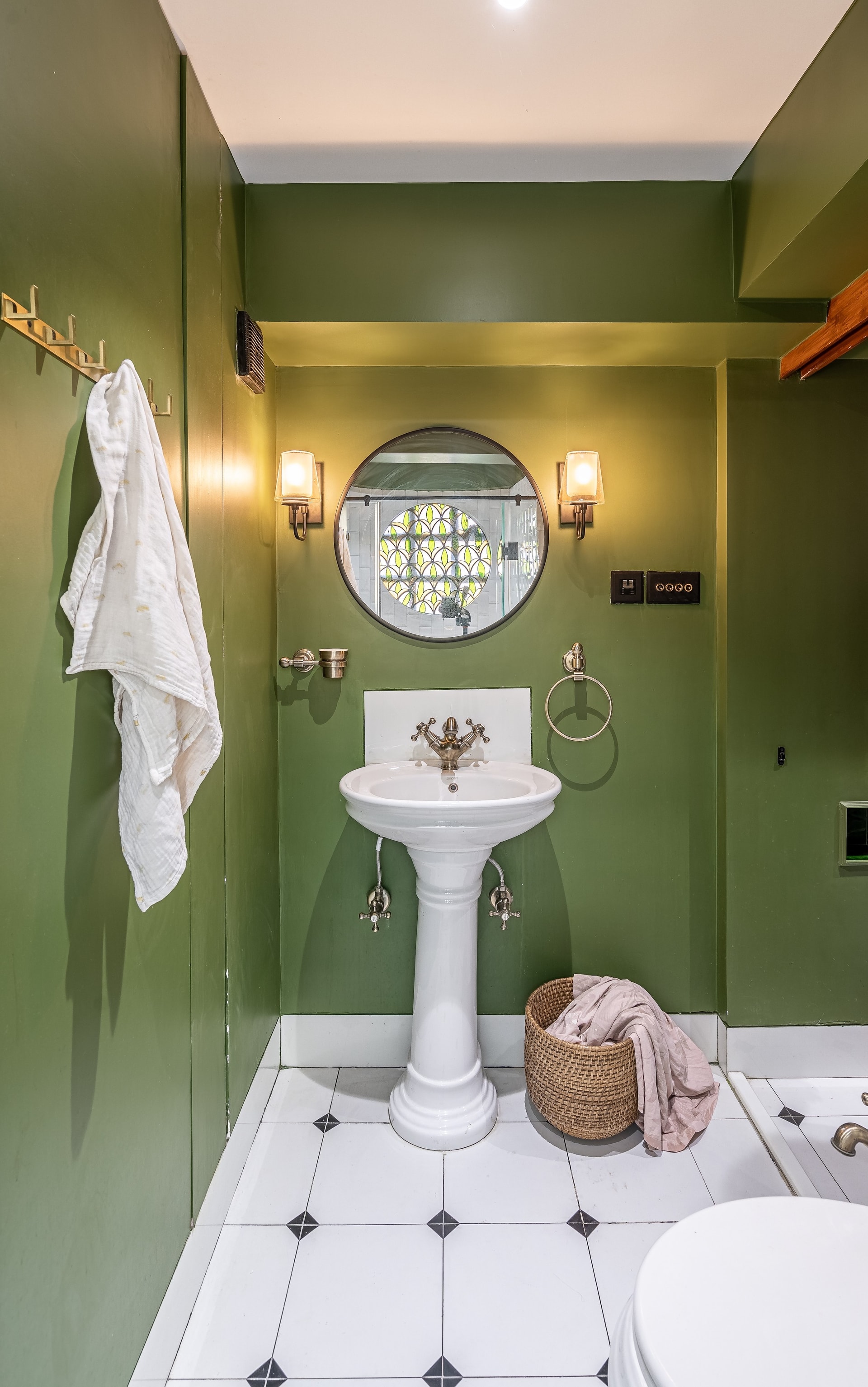 The master toilet is thoughtful design, with its carefully chosen soothing shades of green that create a palpable sense of nature and freshness. Natural light is harnessed to perfection in this space, thanks to clerestory windows that generously welcome the sun’s gentle rays. The aesthetic is further enhanced by brick pattern tiles, which not only add visual intrigue but also work in harmony with the windows to create a sense of opulence and rejuvenation.