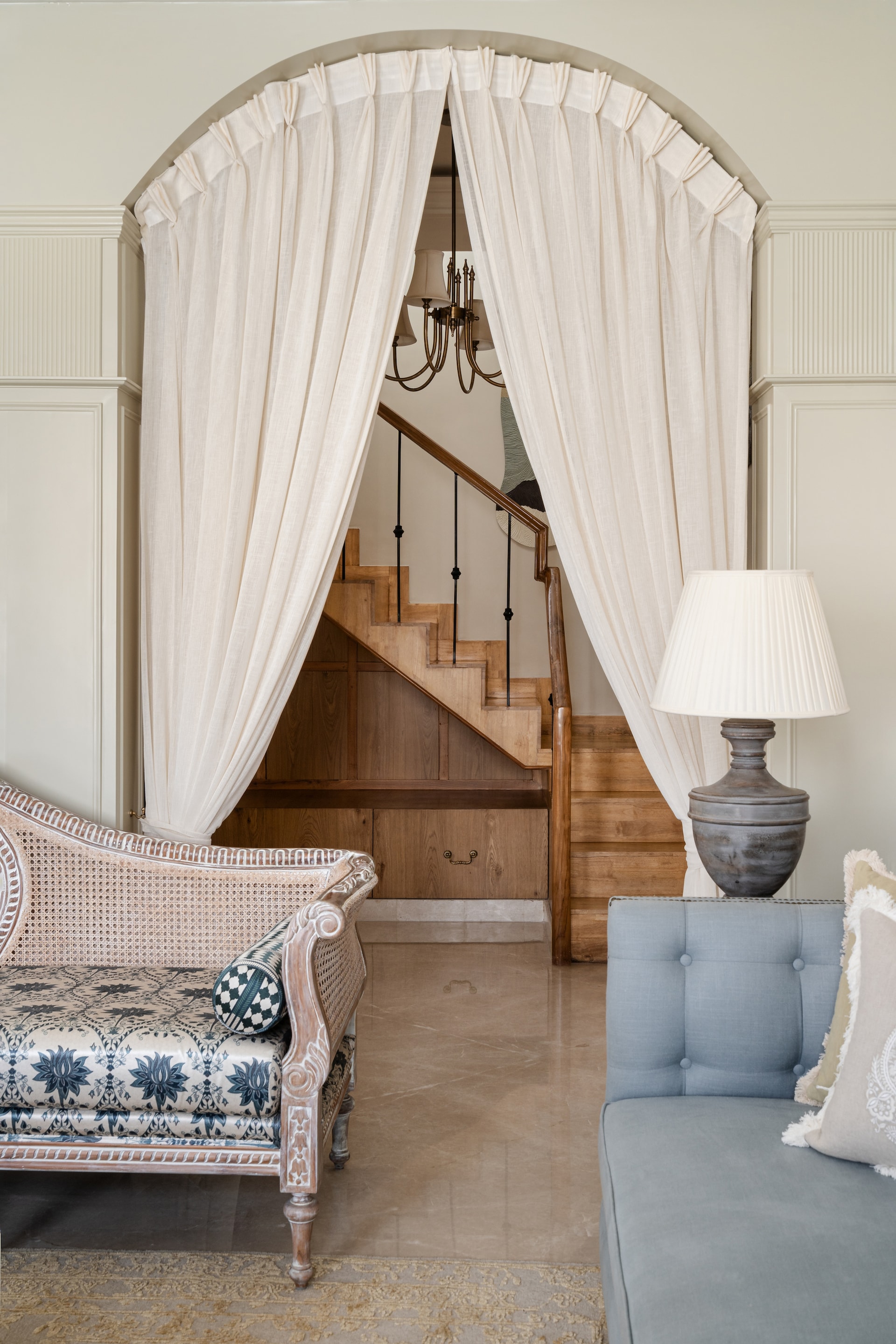 The drawing room on this floor, cordoned off by the arches, is a pastel blue haven. The interaction of soft English colours with the abundant natural light creates a serene, inviting atmosphere. This floor eschews dark tones in favour of a lighter palette, enhancing the sense of space and tranquillity.