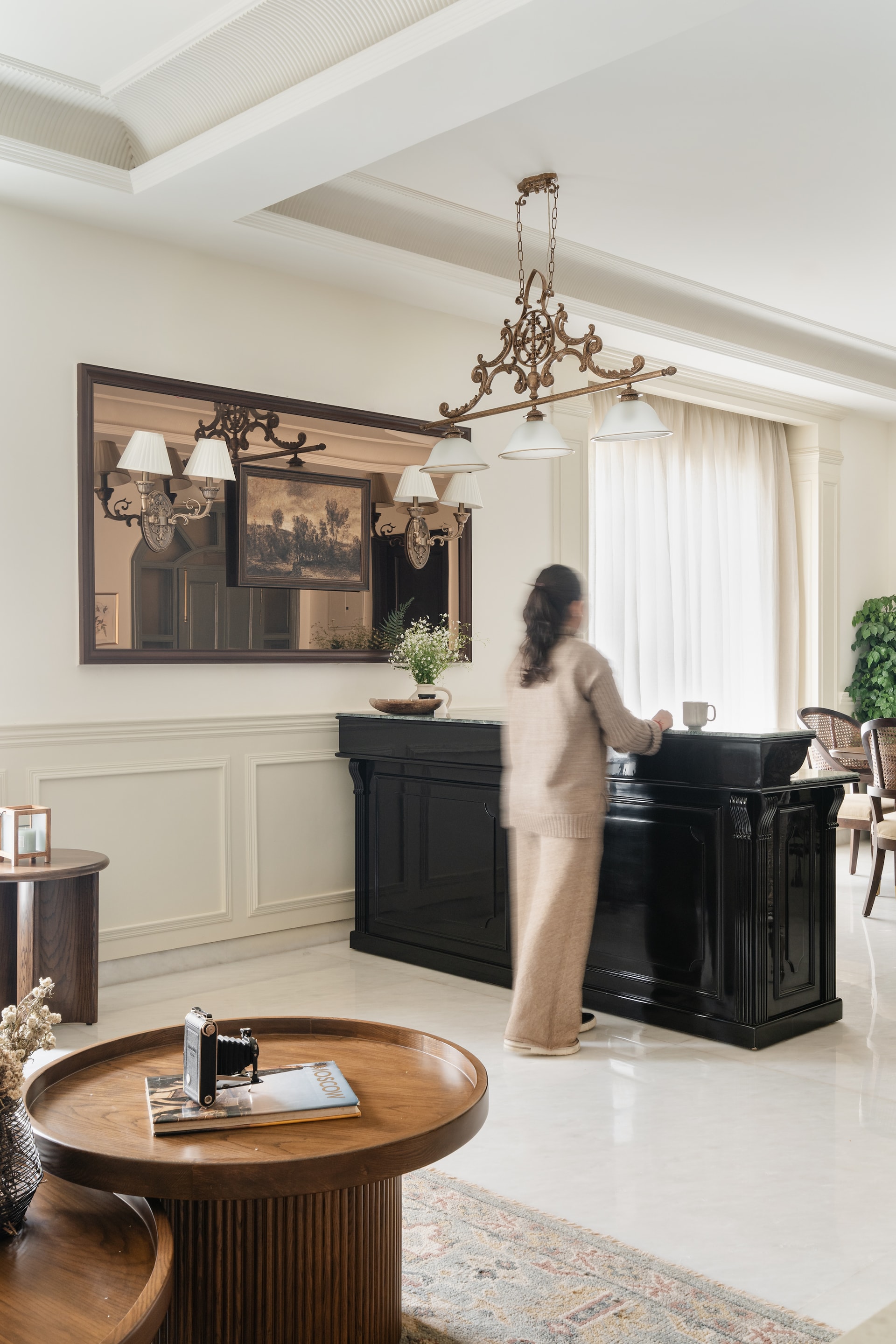 Entering the drawing room, one is immediately drawn to a magnificent French tapestry, an artefact from the family’s travels, which serves as the room’s pièce de résistance. Surrounding this piece, the room’s design incorporates rich, dark teak and oak woods, imbuing the space with a sense of regality. The bespoke black cabinet, crafted by the in-house team, boasts a shadowed polish effect, showcasing meticulous craftsmanship and ensuring that every element contributes to the overall aesthetic harmony.