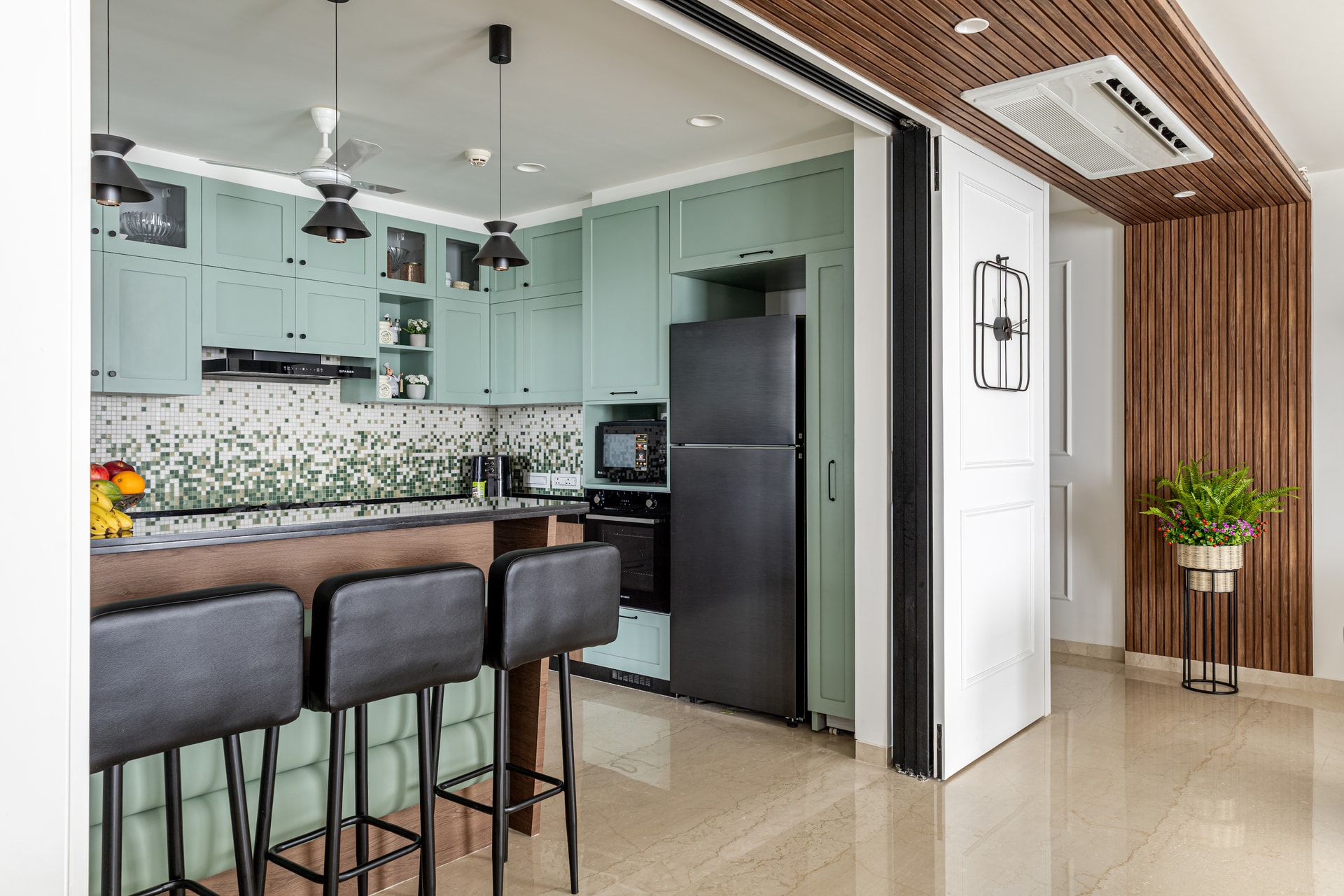 The shaker-style kitchen is a stunning focal point, showcasing a sophisticated blend of sage green cabinetry, wooden-texture laminates, and a striking Bisazza glass tile backsplash. Designed with modern living in mind, the kitchen seamlessly flows into a breakfast counter, creating a casual yet elegant space perfect for morning routines. Glass sliding shutters enhance the sense of openness while providing effective noise control, ensuring a peaceful cooking environment. The minimalist design of the kitchen masks its impressive functionality, with ample storage solutions and thoughtful details that transform everyday use into a delightful experience.