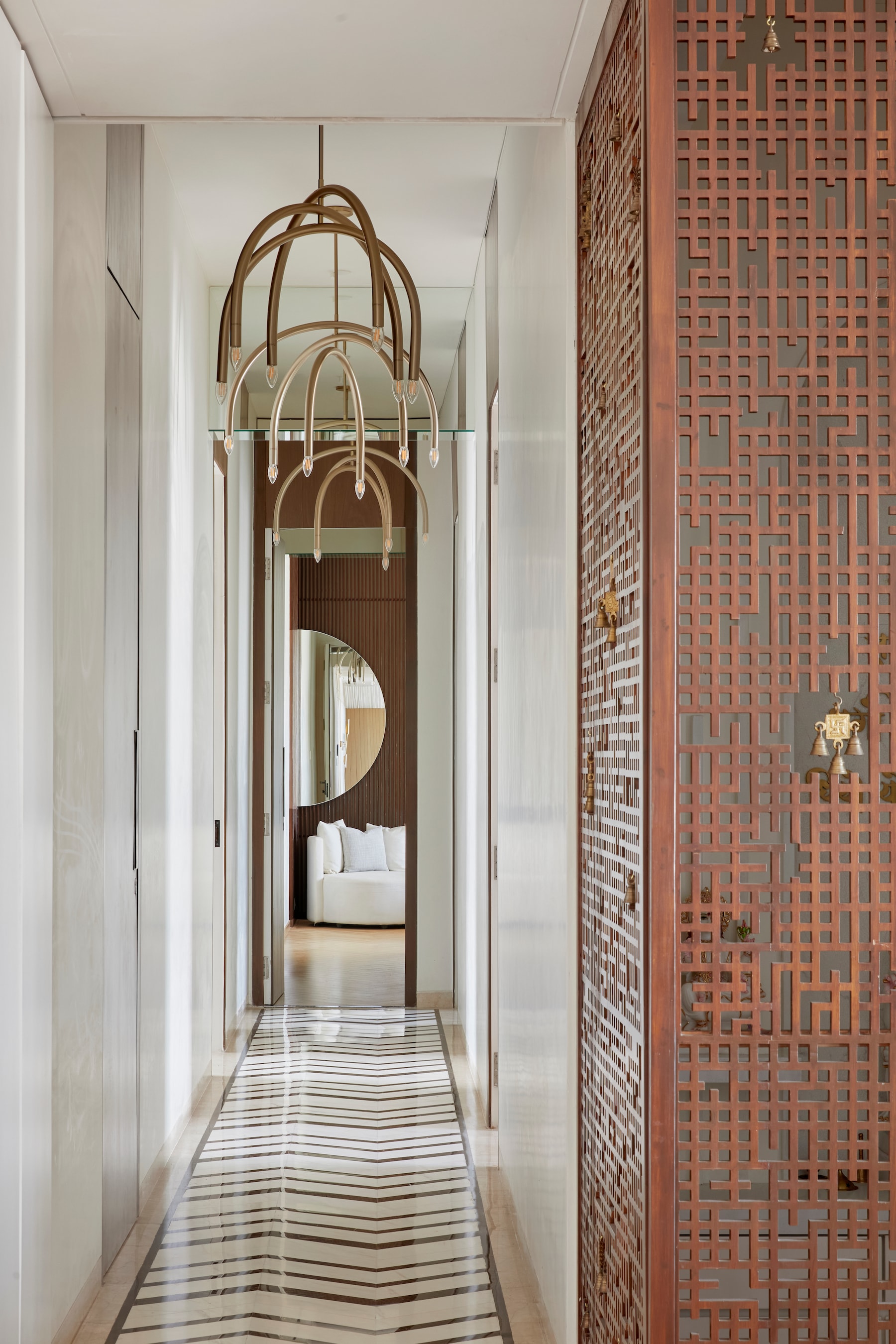 A reinterpretation of the mandir jali design creates a privacy screen between the entry and living space, while light-coloured furnishings maintain a fresh, airy ambiance. The mandir area was reconfigured to include a study corner, separated by a laser-cut wood panel jali adorned with brass bells. The passage, with its 38-foot length, features a dramatic chevron pattern with marble inlays, adding visual interest. The powder bathroom was revamped with honed finish terrazzo walls, a black marble portal, and a pedestal wooden basin to create a chic, character-filled space.