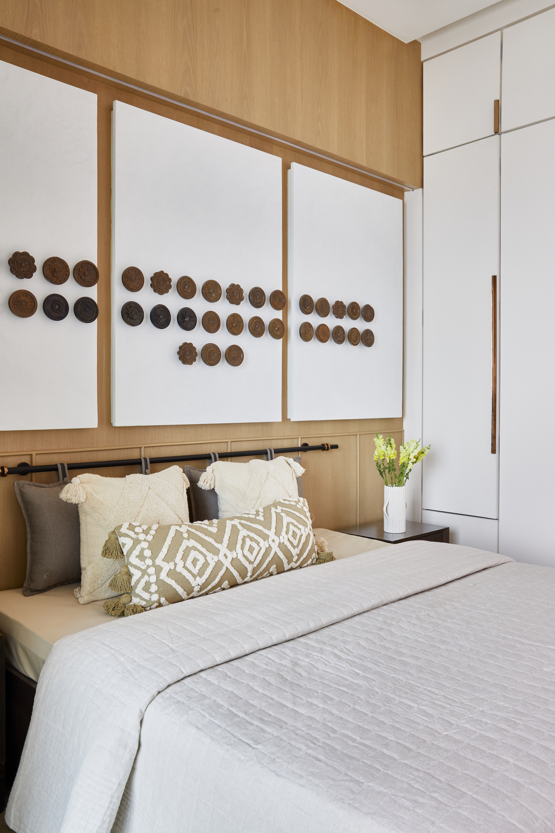 Each bedroom reflects individual preferences while adhering to the overall design concept. The son’s bedroom features his favorite characters and a color scheme of blue, greys, and yellows. The daughter’s room, designed with a chic and edgy atmosphere, incorporates blacks, greys, and blues, with arches as a dominant feature. The parents’ bedroom maintains a minimalist aesthetic with simple white wardrobes and a custom-made metal rod with hanging pillows as the bed wall’s highlight.