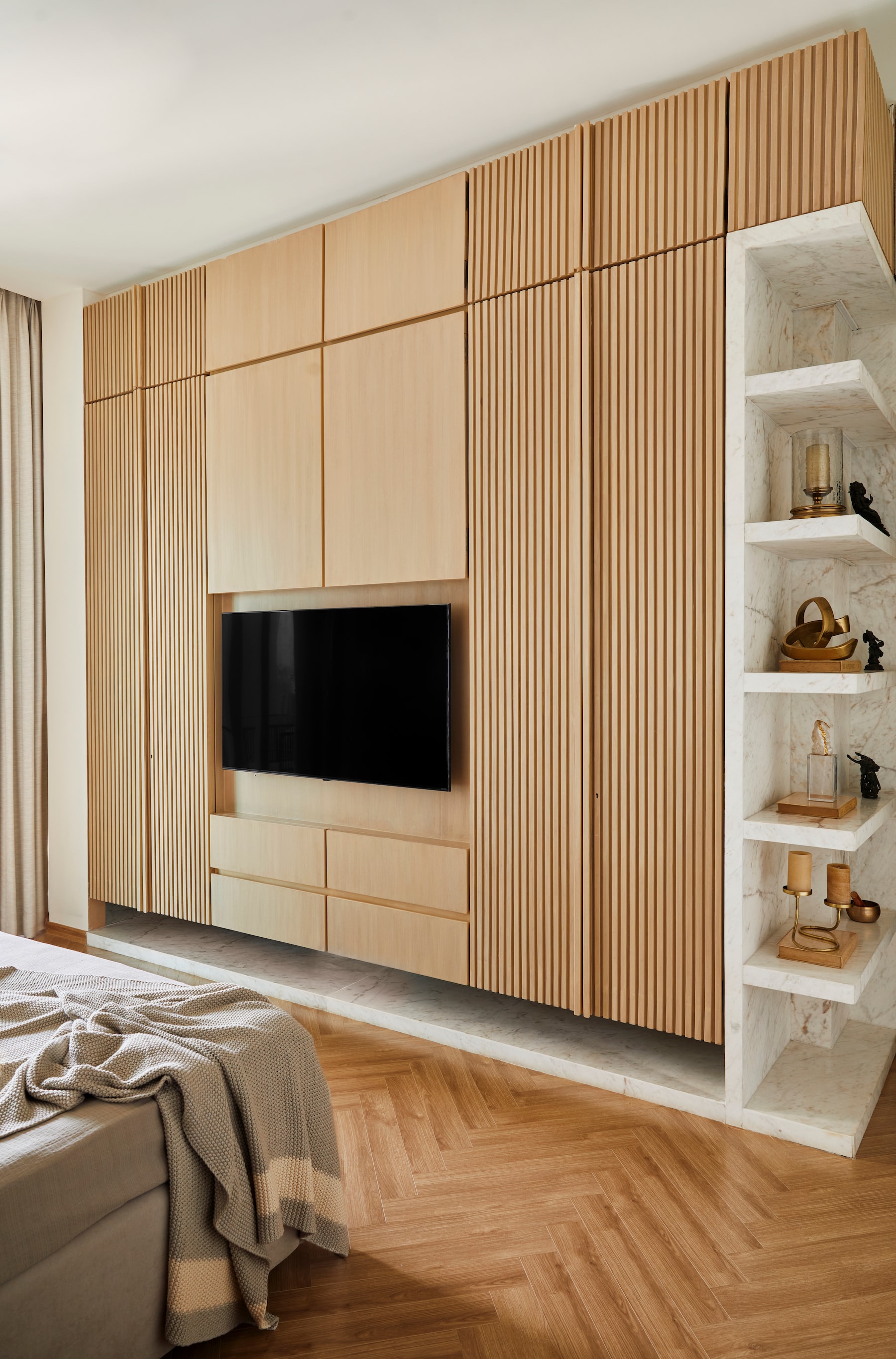 The master bedroom boasts a walk-in area, slatted walnut wood paneling, herringbone-style wood flooring, and mirrored shutters concealing storage, contributing to an elegant and cohesive space.