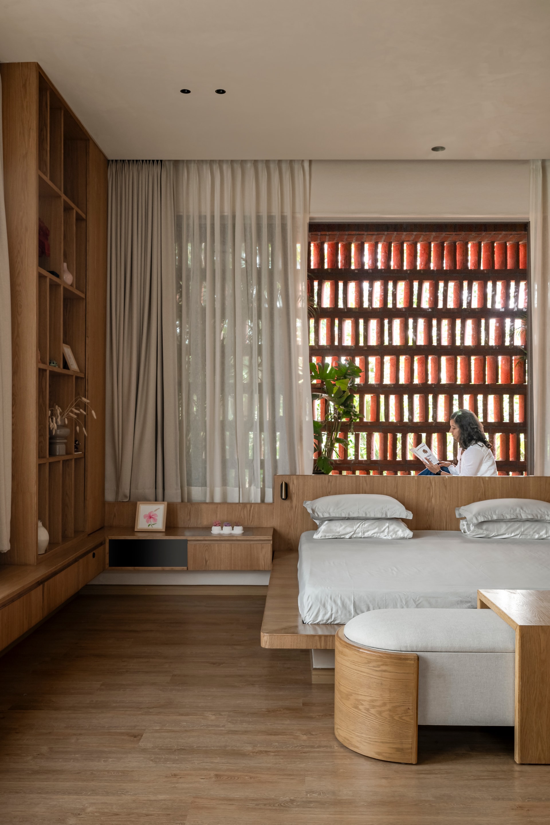 The design brief called for a premium bedroom extension that would remain deeply connected to the outdoors. Orientation became the guiding force, with the east-facing terrace and south-facing bedroom wall shaping the spatial strategy. Large openings, cross-ventilation, and filtered daylight allow the interiors to breathe, creating a constant dialogue between inside and out. Rooted in Japandi aesthetics, the material palette is intentionally restrained—lime-wash plaster, warm wood, natural veneers, and SPC flooring come together to create a soft, tactile environment. Sheer curtains diffuse daylight across the rooms, while rounded bespoke furniture, built-in window seating, and subtly toned fabrics maintain visual lightness. Indigo cyanotype-inspired artwork punctuates the neutral canvas, adding depth without disrupting the overall calm.