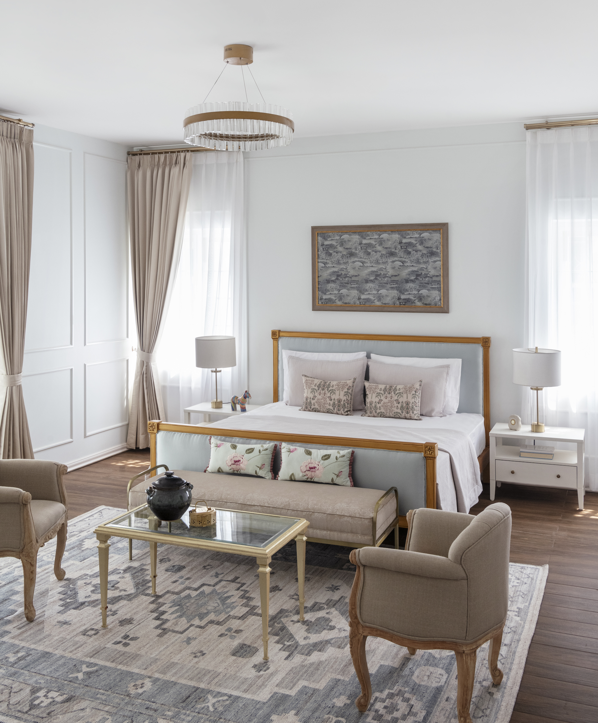 The master bedroom, designed in a cottage style, is a haven of calm with powder blue and beige tones accented by touches of gold. The room opens onto a balcony, where a large painting complements the tropical rustic theme of the space, while rattan furniture and a custom-made chandelier with a distressed finish add layers of texture and interest.
