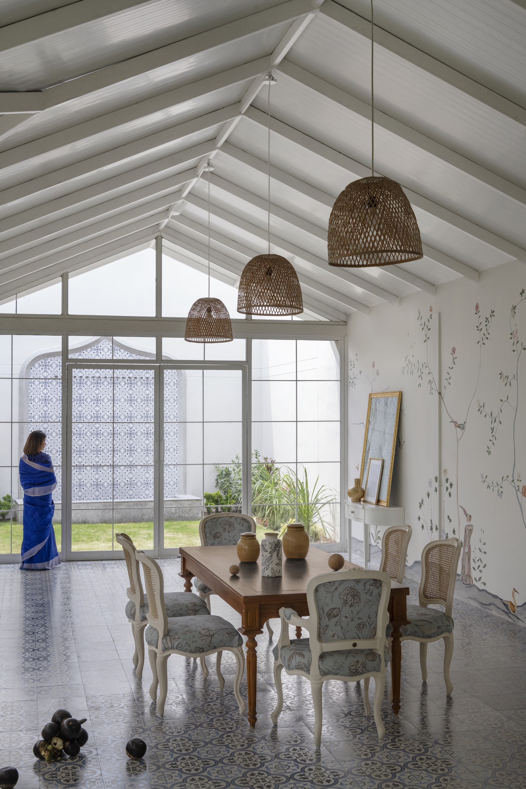 Perhaps the most enchanting feature of this home is the glass house, a space that captures the essence of summer with its vibrant hues and artful details. The passage leading to the glass house is enveloped by greenery, creating a sense of anticipation. Upon entering, one is greeted by a fusion of art and storytelling, with printed tiles and a custom hand-painted mural narrating tales of whimsy. A colonial-style bookshelf and cozy wooden flooring on one side contrast with the printed tiles that open out to a serene water body on the other. The glass house is a magical retreat, encapsulating the playful yet sophisticated spirit that defines this home.