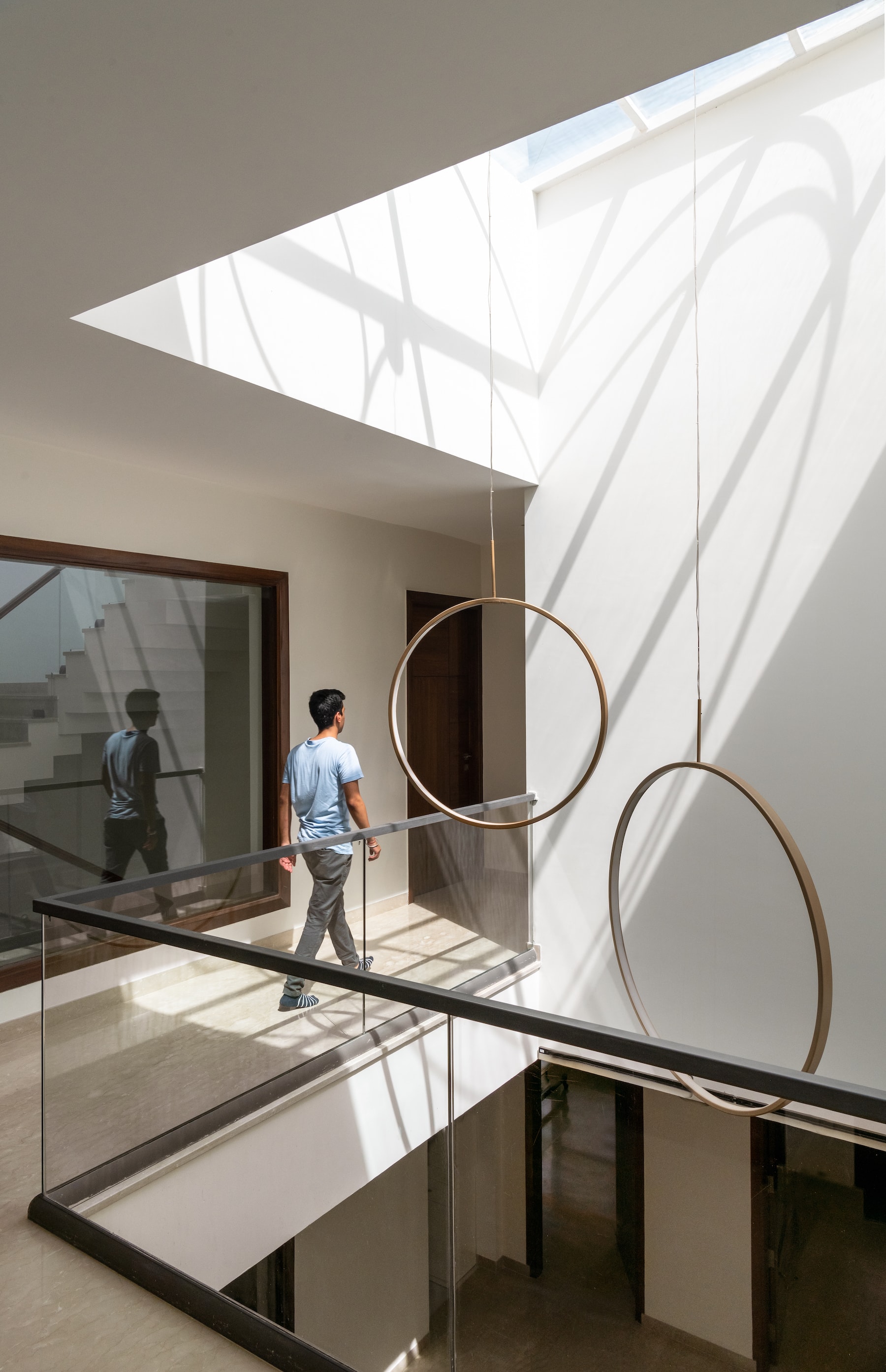 Despite the restrictions imposed on possible planning solutions, the treatment of the space is not just limited to interiors. Approached through an unpigmented foyer, with functional seating and details, one gets the opportunity to feast on the shift of volume through the double-height dining space. Uplifting the effect of the existing skeleton, the massive skylight bathes the central, focal space in the warm embrace of the sun. It presents as the showstopper of the design, with a wide horizontal expanse, riddled with M.S. flats perceived as circular emblems under the clear sky. The shadows created through the passing light create patterns, alternating with every changing angle of the sun, making this a truly dynamic space. This enables the aforementioned quintessential ethos to shine through this subtle dynamism, bringing the users closer to their nature and surroundings. Adding another layer, vertical circular lights hang from the ceiling, adding a geometric depth, and extending the horizontal circular essence of the design into the vertical axis as well.