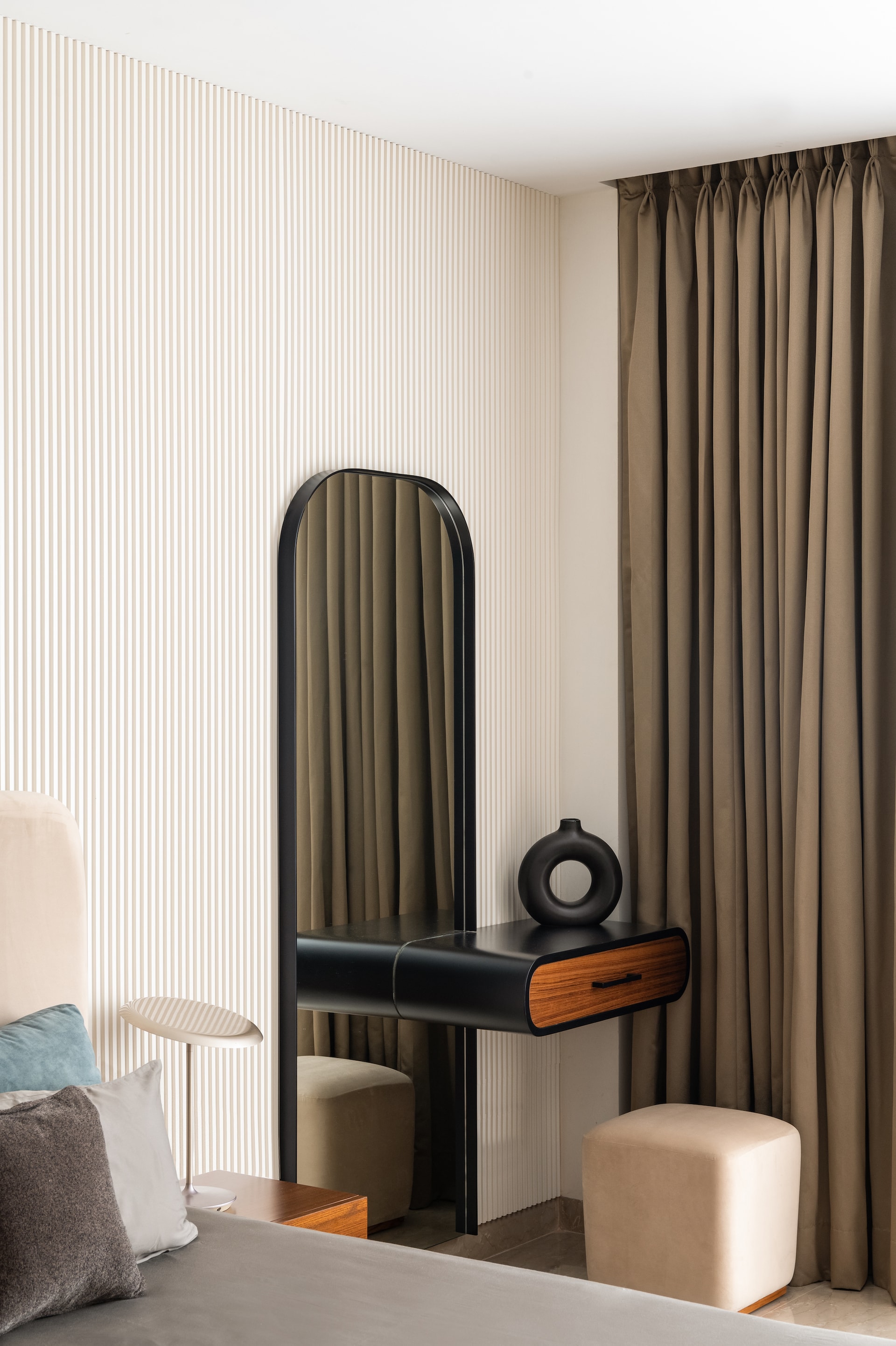 Staying true to Studio Dot’s authentic design ethos across various genres, the design upholds by mirroring the ambiance of the outside, and inside as well. The material palette of the design is minimalistic, allowing materials to revel in their truest form, straying from masking their effect through colored coats. The clean, white space is periodically punctured with a multitude of wooden finishes, the shades, and textures complementing each other’s form. Each room is provided with a subtle hint of varying definition through fluting styles, a careful selection of dark, well-stained stones; and hints of brass and coated mild steel elements. To further complement the effortless marriage of these materials, one can witness a light sprinkling of a bright selection of fabrics in each space. The essence of the residence shines through its details and integrities spread throughout the design. They start from the main gate itself, created as a semi-permeable casing following gentle curves, reducing the overpowering nature of the edifice. Inside the house, the details are sprinkled around, in the form of furniture elements. Through statement legs and a meticulous blend of materials, we introduce playfulness into the design.