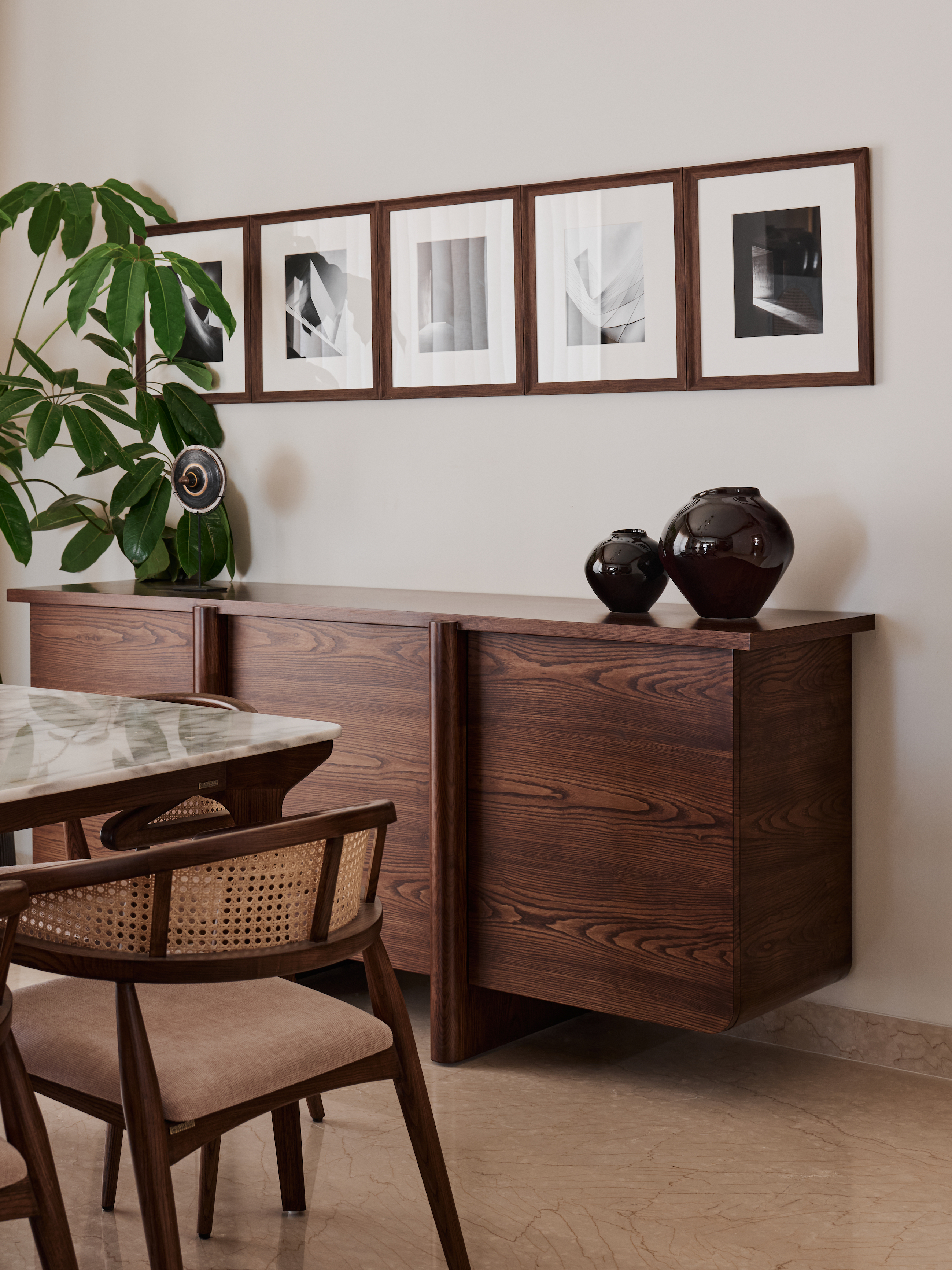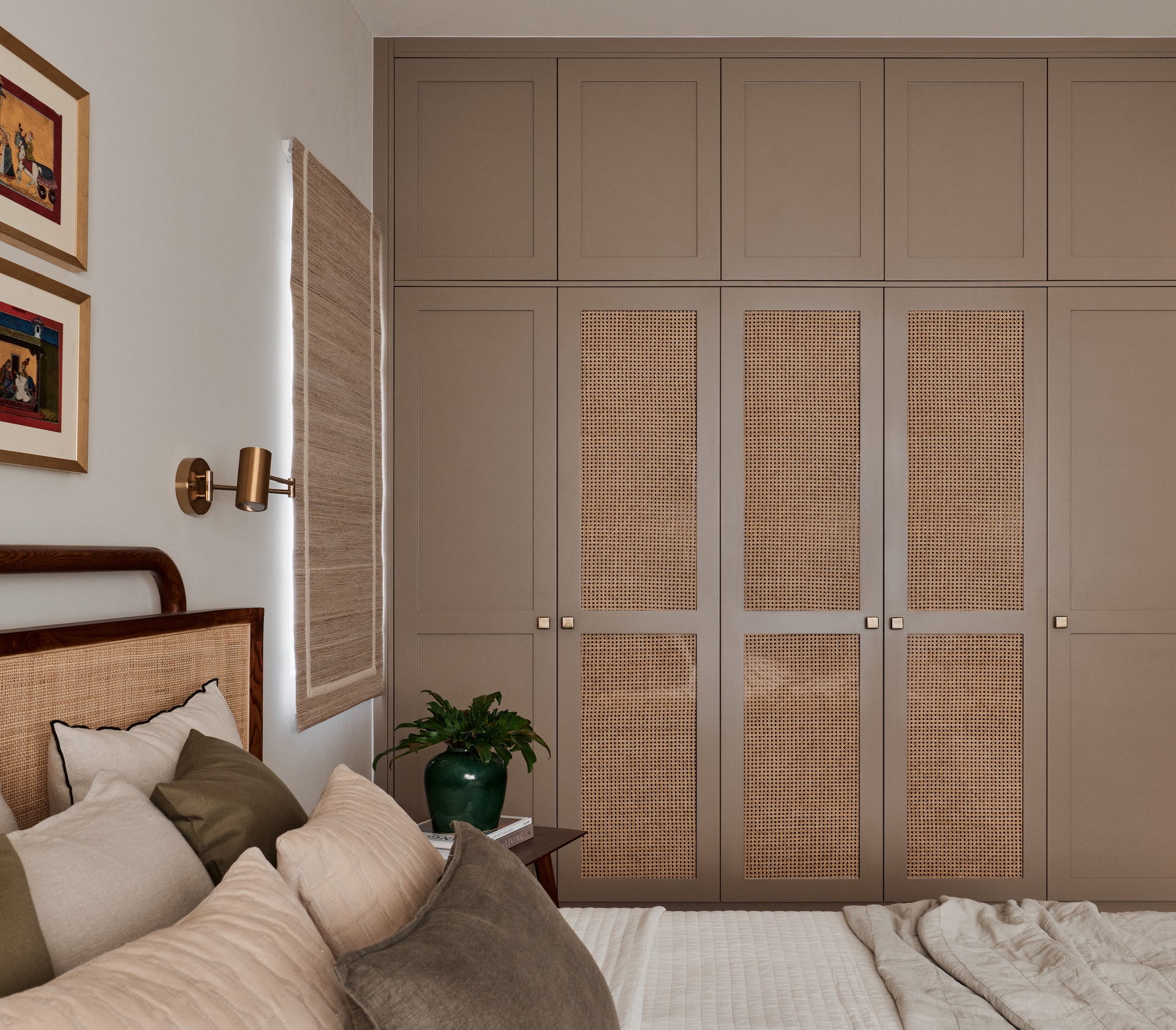 The bedrooms continued the theme, with muted tones and clean silhouettes. Wooden and cane detailing carried through, like a soft refrain in a familiar song, provides textural interest and visual continuity. In the master ensuite, a cane-woven headboard, wardrobe shutters and blinds attain a cohesive look, while in the second bedroom, the upholstered backrest extends on either side, wrapping the side tables in an embrace, just like a tree hugging you back. The guest bedroom, by contrast, achieves a minimal look with dark brown hues timber and white plastered walls. “Every design decision, from colours, furnishings to details were made with both intention and empathy,” says Manisha. “How would this feel to live in, day after day? How would this wear, age, and evolve with the people inhabiting it?” she adds.