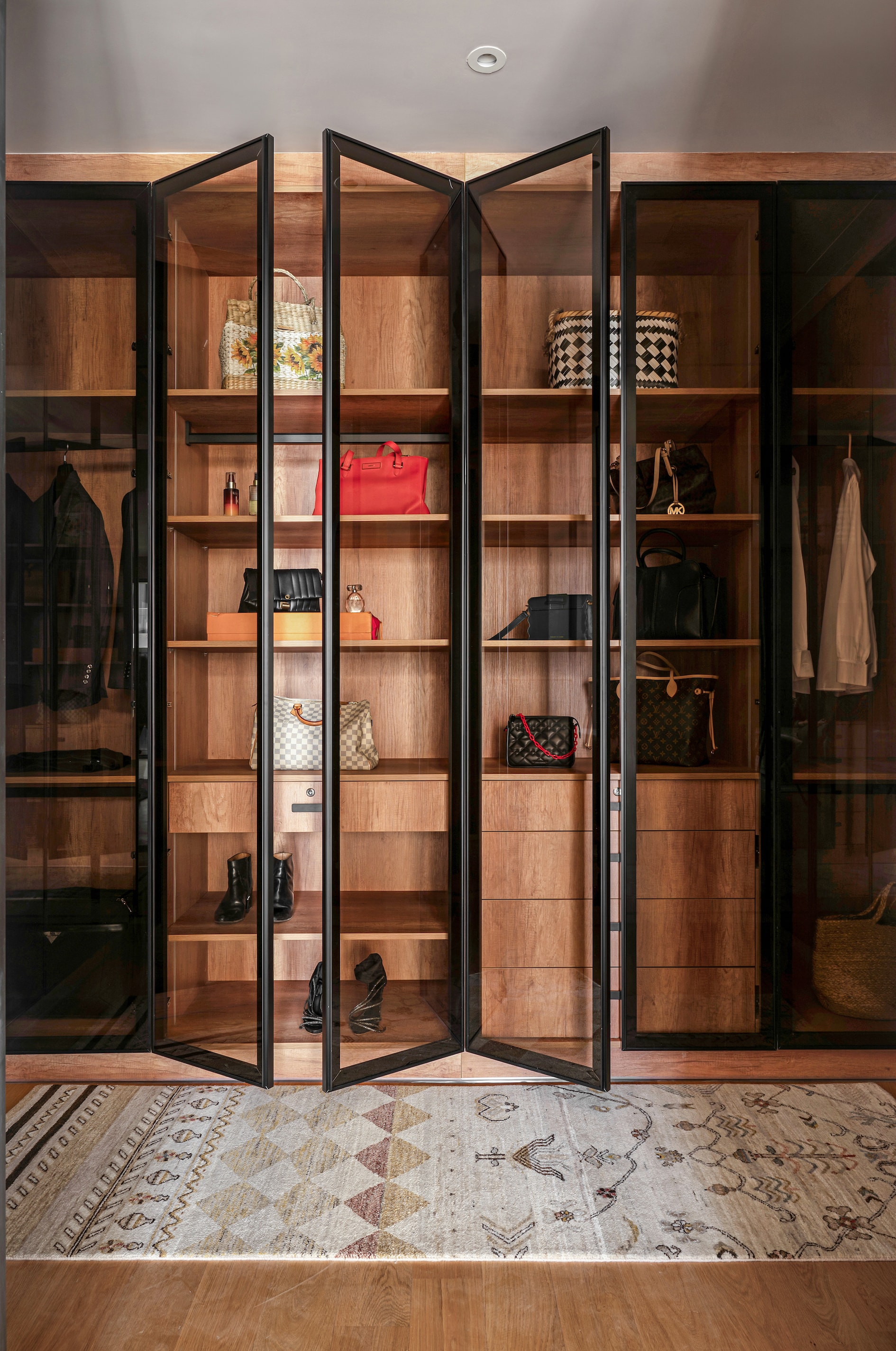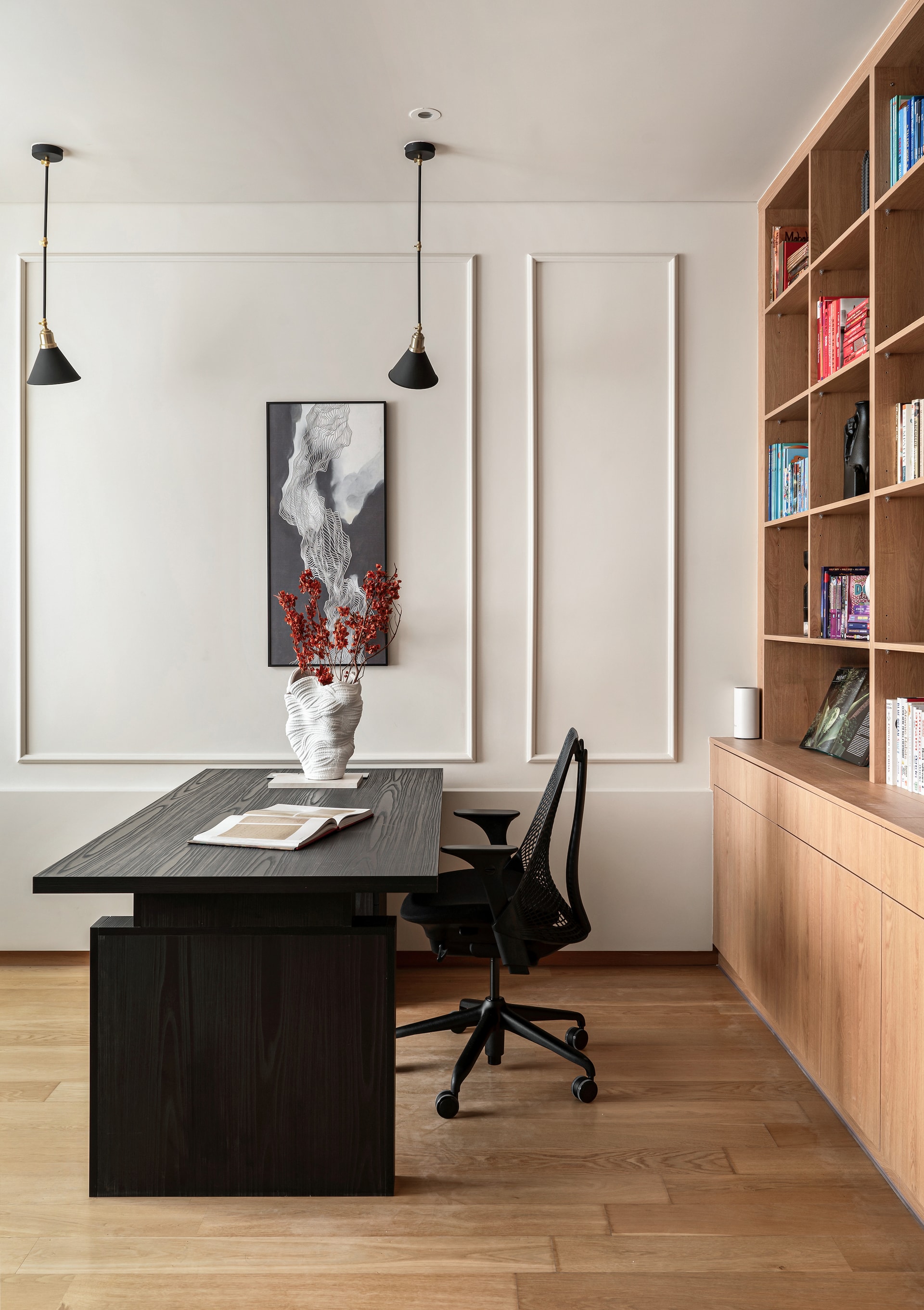 More than just a workspace, Ananta’s home office is designed as a sanctuary of thought and creativity. A full-length oakwood bookshelf anchors one side, imparting warmth and gravitas, while the opposing wall, clad in classic wainscoting, exudes understated grandeur. A black-stained wood desk, paired with a Herman Miller chair, forms the functional core, ensuring both comfort and productivity. Yet, the space transcends its utilitarian purpose. An emerald green sofa bed, positioned adjacent to a streamlined media unit, transforms the room into an intimate retreat. Above, a captivating painting of Varanasi by a local artist imbues the space with cultural authenticity, grounding the room in its Indian context.