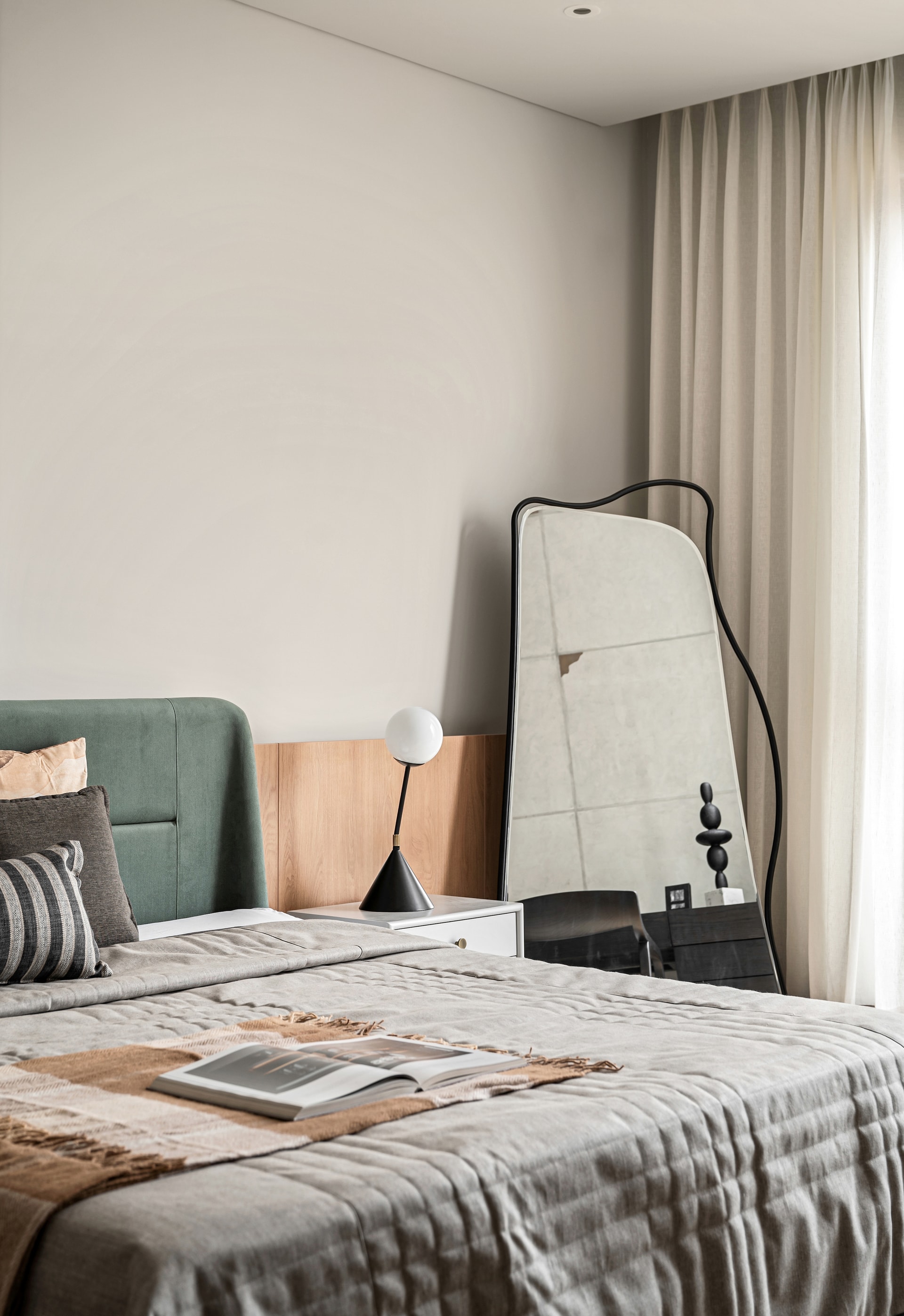 The son’s bedroom presents a fresh interpretation of grey, proving that the hue need not be synonymous with monotony. A bold green bed acts as a focal point, juxtaposing the otherwise neutral palette to create a balance between vibrancy and serenity. A streamlined study area, featuring floating shelves and a minimalist aesthetic, maintains an uncluttered atmosphere conducive to focus and creativity. The wardrobe, punctuated by centrally embedded oblong shelving, disrupts the monotony of solid blocks, infusing the space with lightness and dynamism.