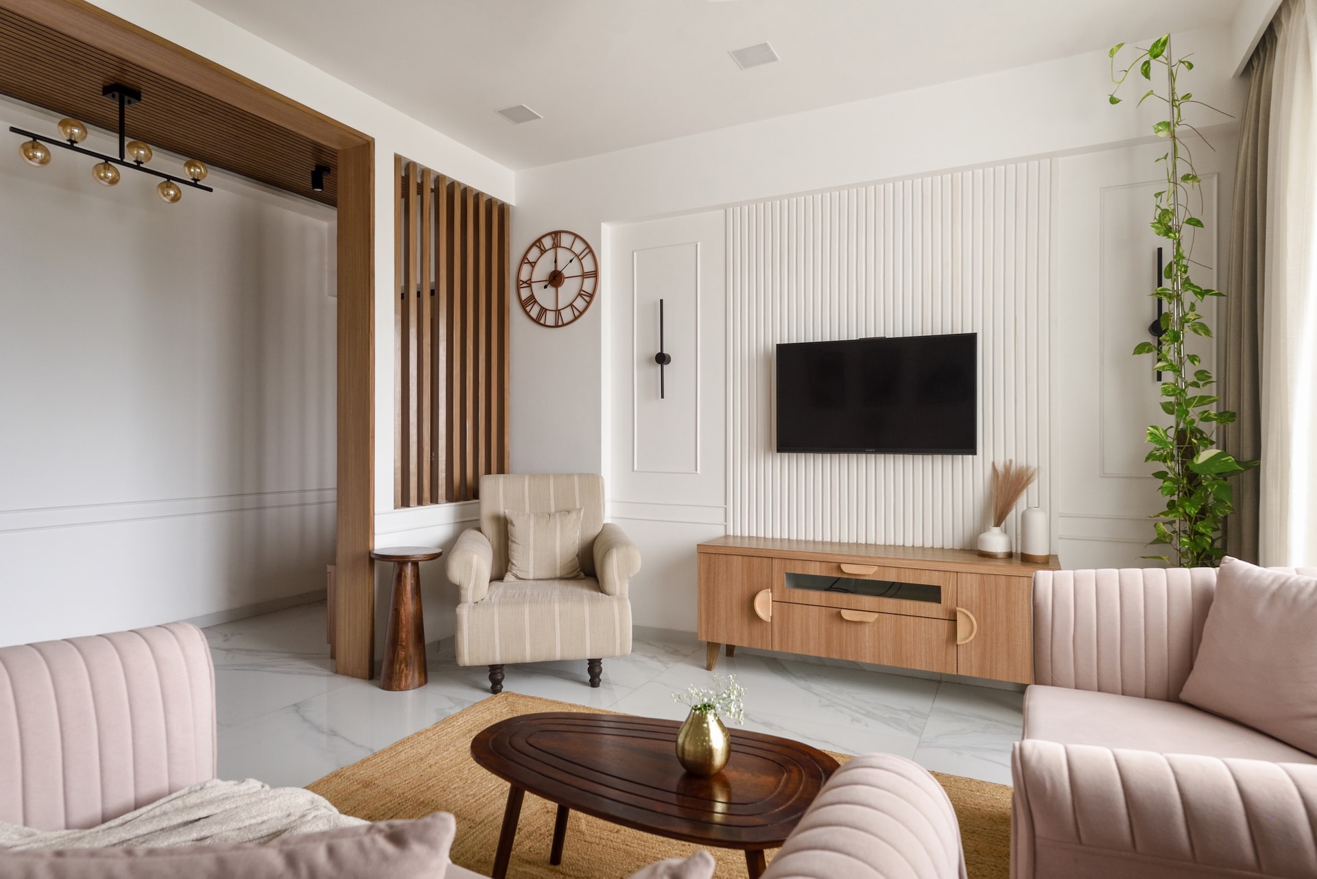 The design narrative extends into the finer details, where each element is thoughtfully curated to merge seamlessly with the overall theme. The furniture and decor pieces, selected for their understated elegance, complement the dominant white and brown palette while introducing subtle pops of colour through accessories and upholstery.