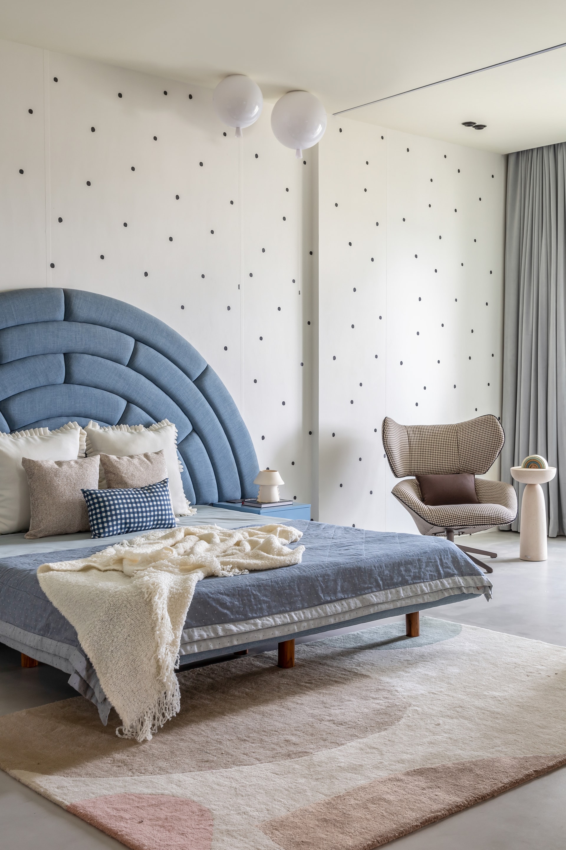 Beyond the shared spaces, the home continues its narrative of thoughtful design. The master bedroom is a quiet sanctuary, defined by soft furnishings, diffused lighting, and textural layers that invite comfort. Here, the design is about withdrawal—a space that lets its inhabitants rest, reflect, and reconnect.