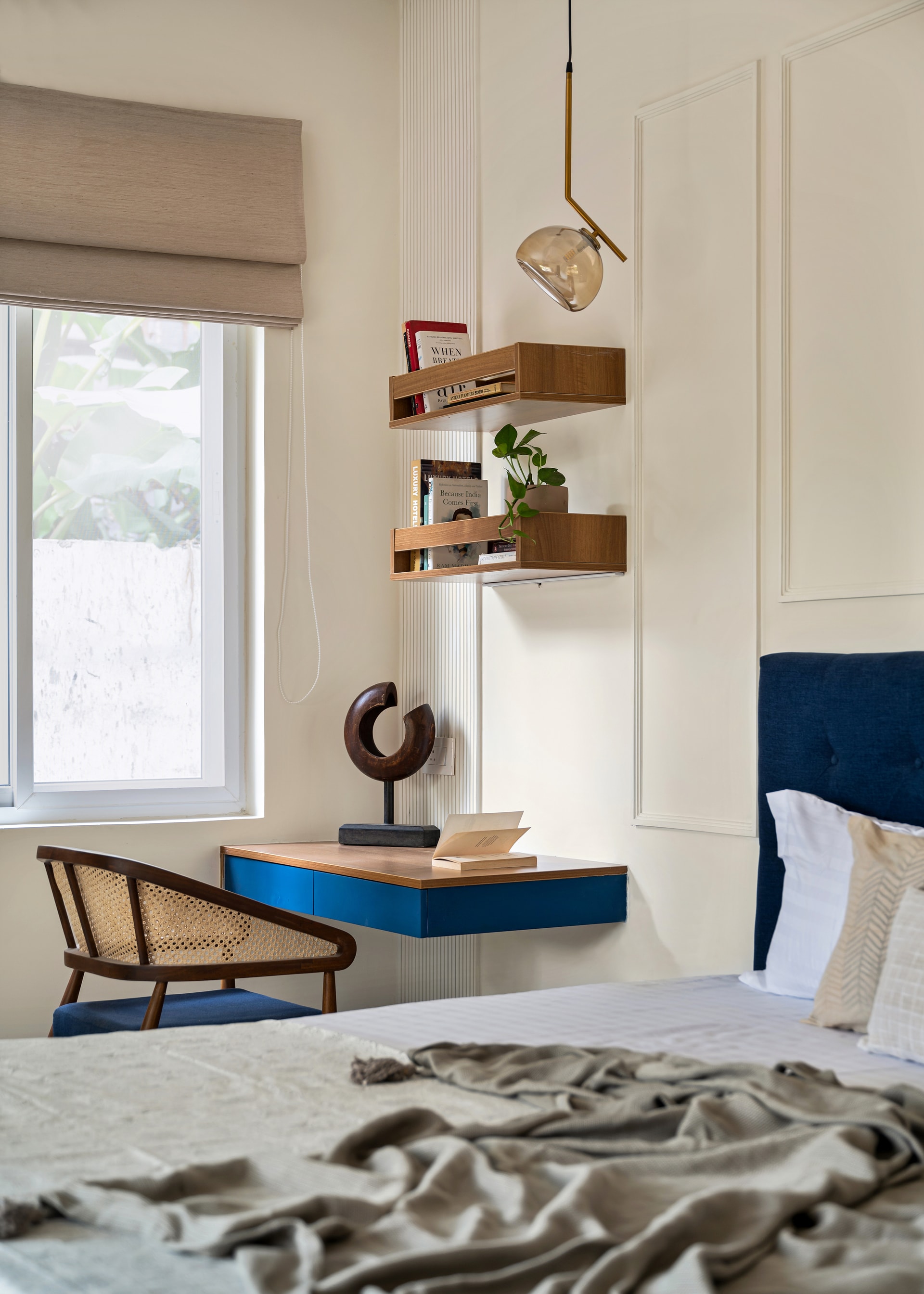 A harmonious color palette of whites and rich browns is punctuated by delightful pops of calming blue in one of the Bedrooms. The careful selection of colors creates an ambiance that is both inviting and soothing, making this room a true sanctuary. A window seating nook graces the space, providing not just an element of comfort, but a cozy corner for contemplation and relaxation. The functional elements of the room seamlessly integrate style and utility, with the dressing area and study table boasting a sleek and minimalist design that exudes modernity. However, it’s the walk-in wardrobe that truly captures attention—a masterful composition of blue panelled shutters and elegant golden handles. This infusion of sophistication adds a touch of glamour to the practical aspects of the room, demonstrating a meticulous attention to detail that defines the essence of this captivating dwelling.