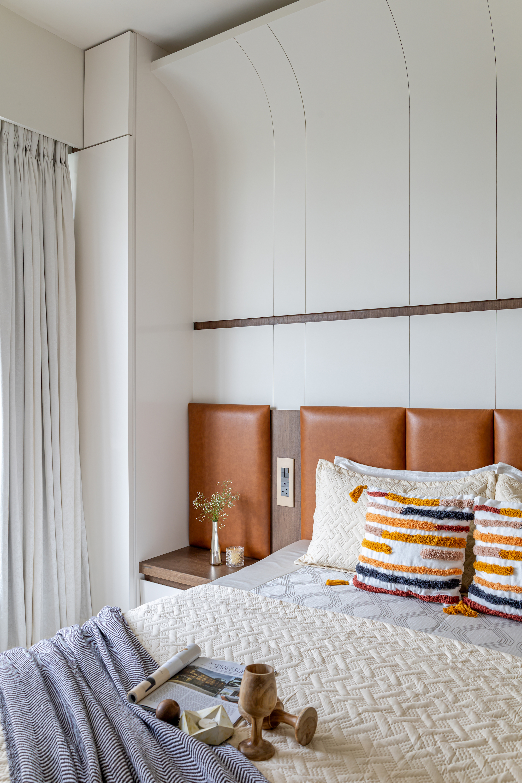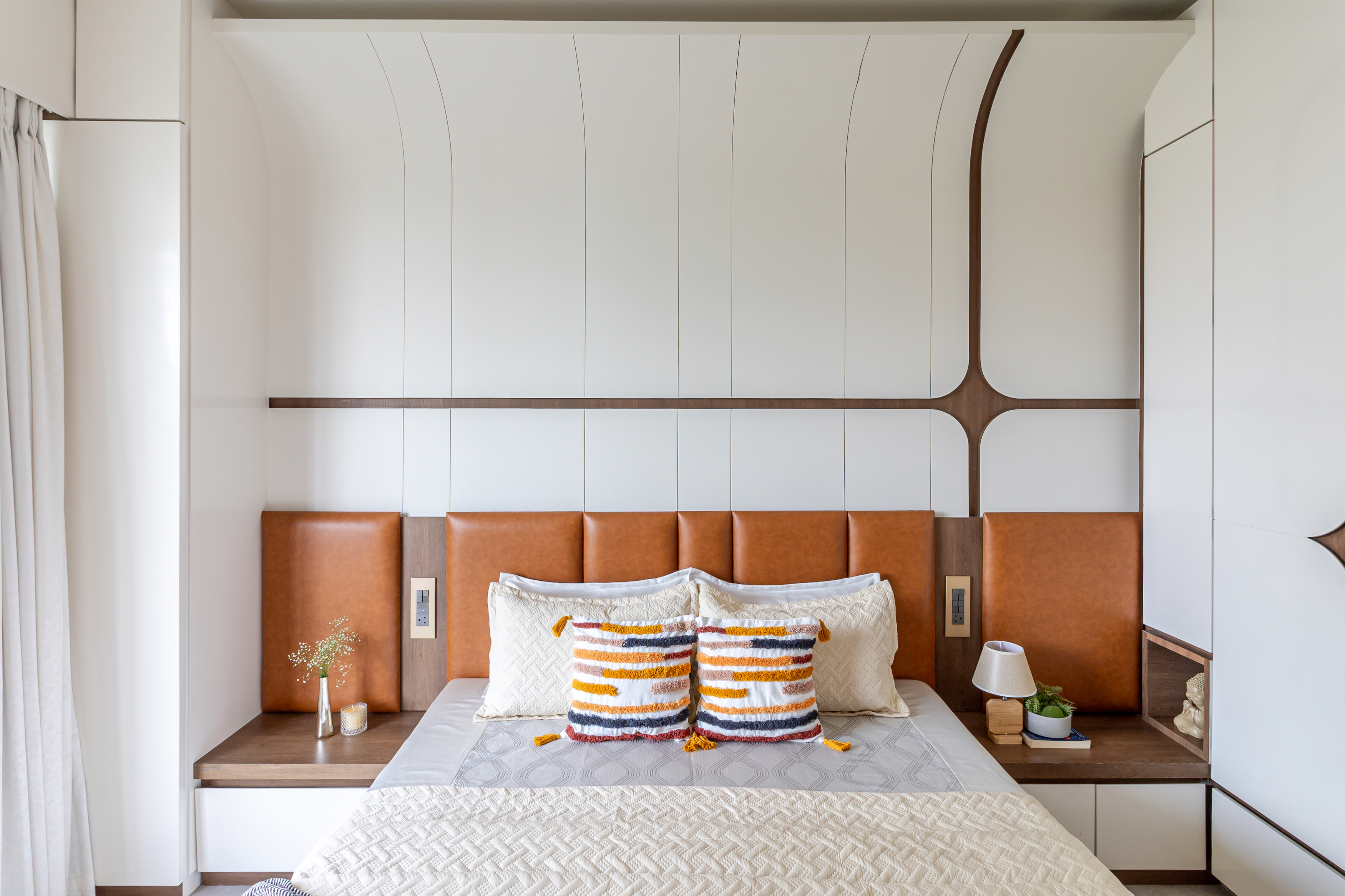 In contrast, the Parents’ Room embraces a Wabi-Sabi theme, featuring a serene white and wooden aesthetic. The space is elegantly grounded by its monochrome colour scheme, where soft white walls and natural wooden accents create a harmonious and balanced atmosphere. The wooden elements, including the intricate bed back paneling and concealed handles on the cabinetry, contribute to the room’s understated elegance. The bed’s curved back panel, with its gentle contours, adds a touch of grace and fluidity, enhancing the room’s overall tranquil vibe.
