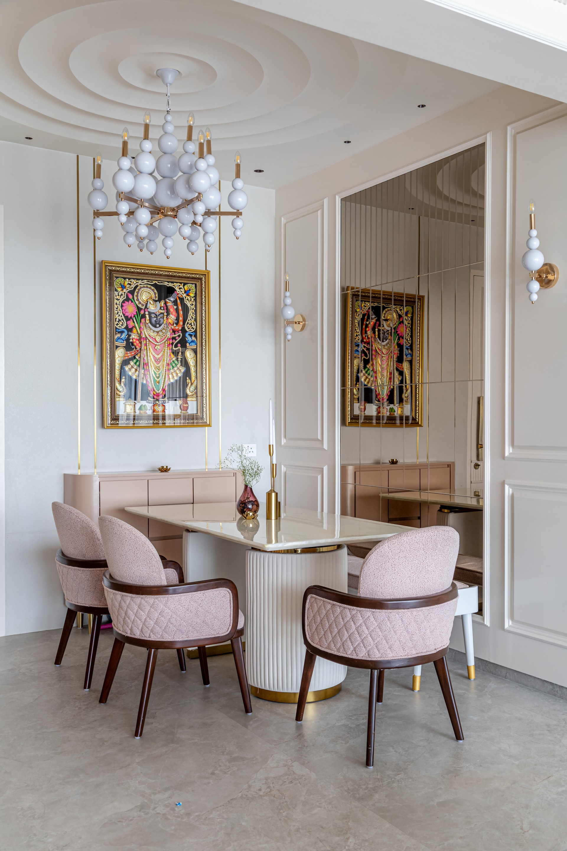 The dining area captivates with its curved, raindrop-themed ceiling, a design element that immediately draws the eye. A luxurious chandelier hangs above, casting a soft, elegant glow over the space. A brown mirror on the adjacent wall enhances the room’s sense of depth and scale, contributing to a harmonious and inviting environment.