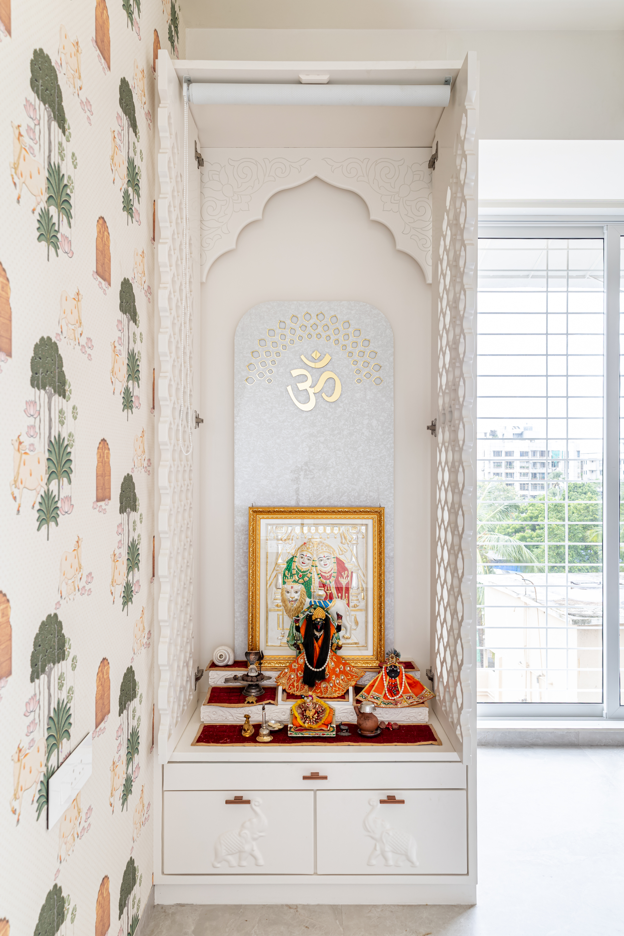 The Mandir Room offers a serene space for spiritual reflection, blending traditional and modern design elements seamlessly. The calming white color scheme and minimalistic approach set a peaceful tone, while traditional jali-style doors with pocket shutters and indirect lighting cast beautiful shadows, enhancing the room’s tranquil ambiance. The backdrop features an OM symbol with backlighting and a mother-of-pearl acrylic finish, adding a touch of spiritual elegance. Drawers adorned with intricate elephant engravings further elevate the room’s regal and serene atmosphere.