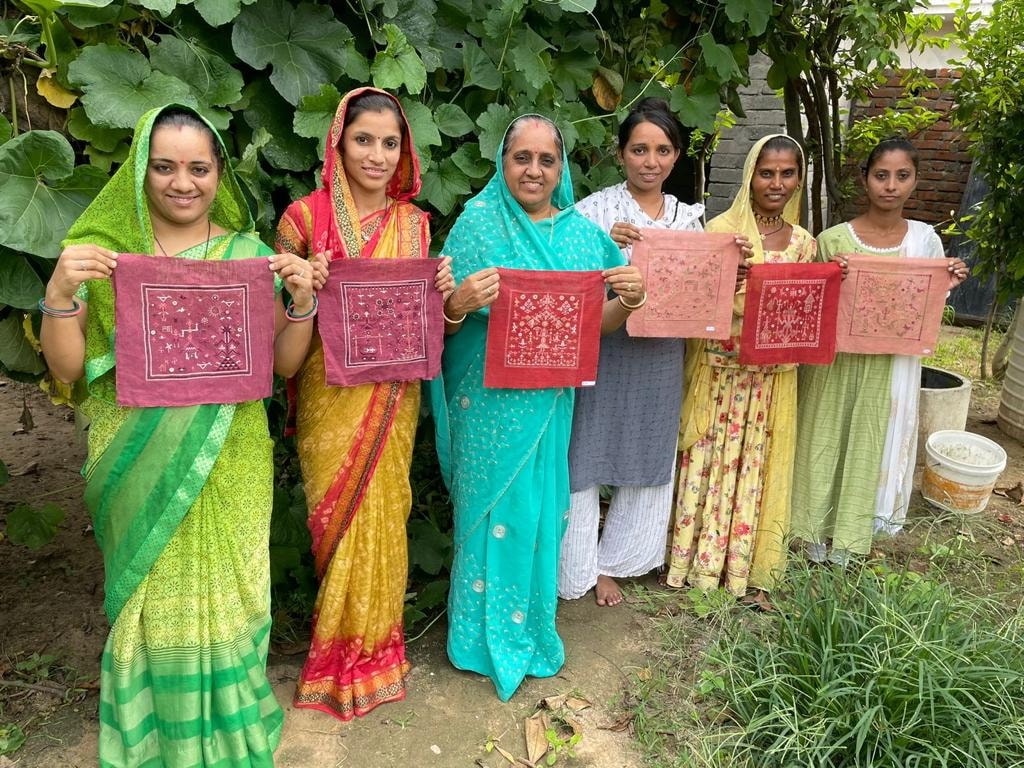 Each element in each artwork also runs an organic thread of diversity, hope and pride. The installation of embroidered quilts in the Ullas installation follows the universal tradition of quilt-making, which is a wise and sustainable way of recycling old saris, headcloths or leftover fabric from tailor shops. The artisans who created the patchwork of pieces for the blue- and red-toned quilts were given minimal instructions. As ‘Ullas’ or joyfulness is the overarching theme for the embroidered quilts, each woman was asked to express her happiness. The bird was also suggested as an occasional motif, a symbol of happiness. Apart from that, she had the total freedom to evoke on fabric the intense happiness, the boundless love she feels for her child in her heart, using her own imagination.