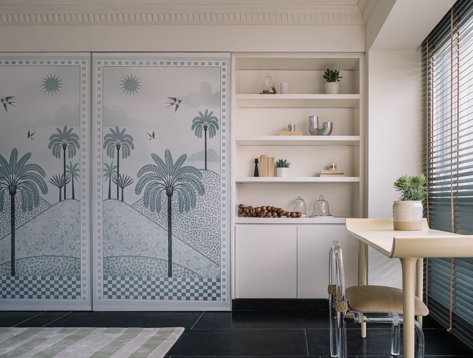 Meanwhile, the son’s bedroom—a joyful ode to childhood—is meticulously designed for adaptability. Powder blue and white beam-patterned ceilings, custom hanging lamps by MGM, and modular elements like a detachable ball pit and slide ensure the space grows with him, effortlessly transforming into a study or lounge in the years to come.