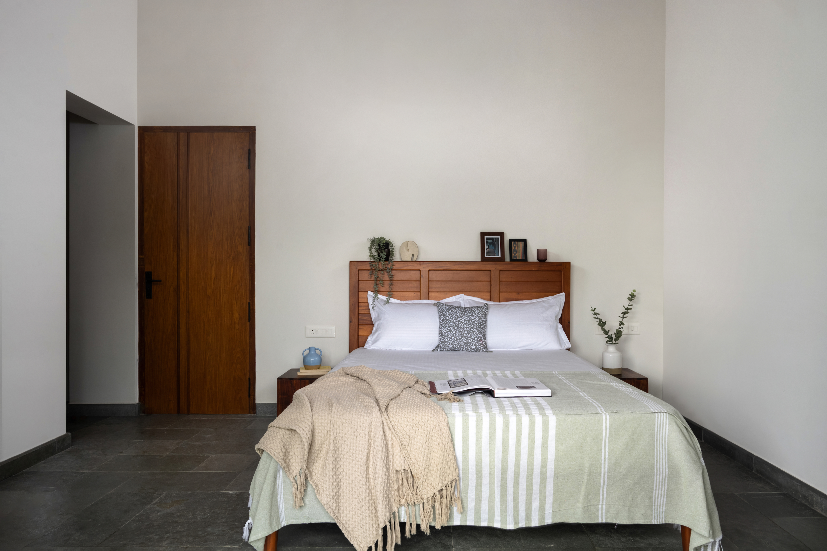 The material palette is a masterclass in subtle sophistication. Exposed concrete plaster on the ground floor is accented by crimson highlights, while leather-finish Kota and Jaisalmer stone flooring bring rich textures to life. Playful patterns in the flooring mark key transitions and level changes, adding a layer of visual intrigue. Polished teak wood doors, adorned with vertical beadings and grooves, enhance the sense of height and elegance, while jet-black granite window jambs frame each view as a living painting, inviting nature into the home.