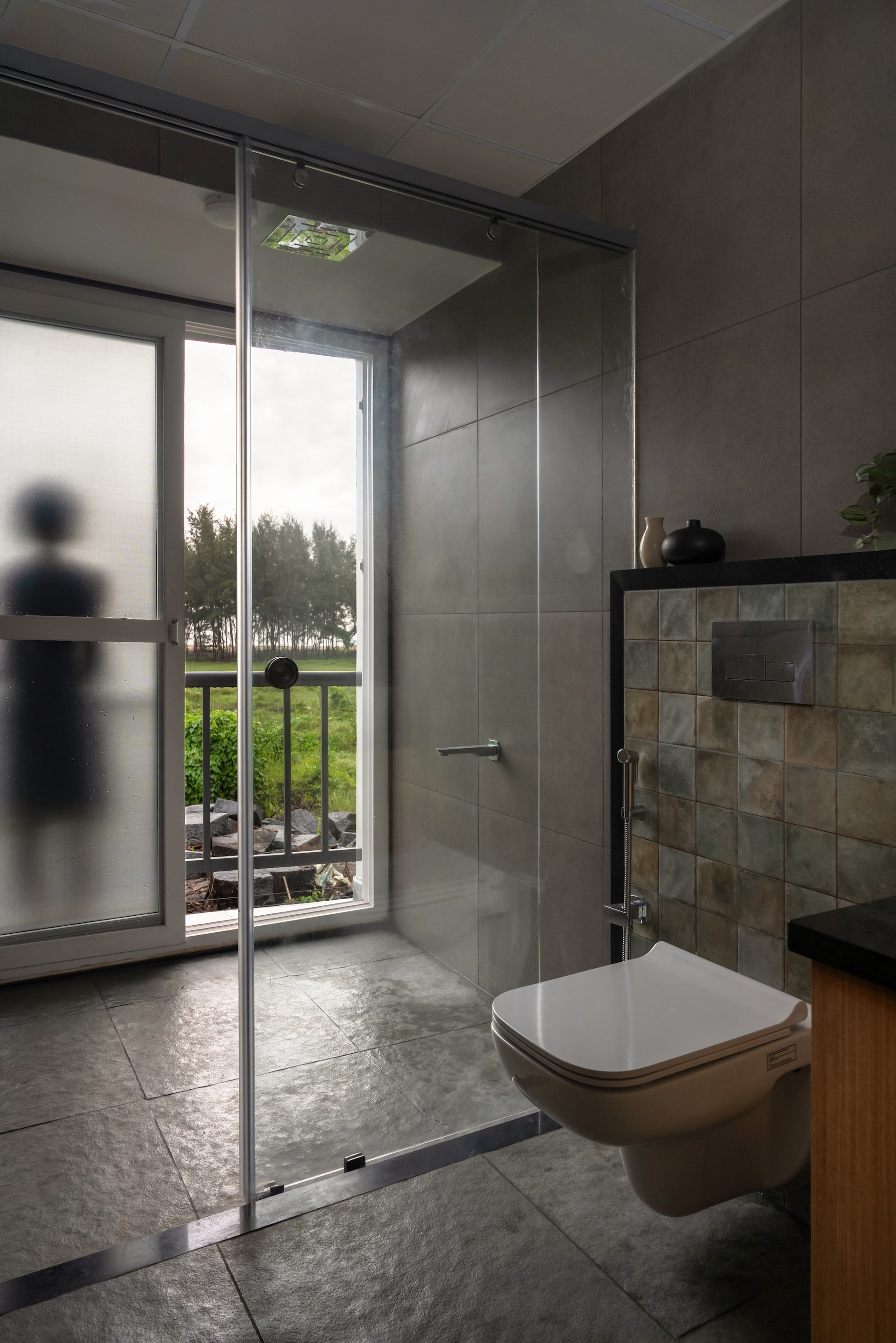 A well-lit corridor, lined with a bay window and illuminated by circular skylights, leads to two bedrooms. Each room is a sanctuary of tranquility, featuring asymmetrical sloped roofs, clerestory windows, and deep balconies that frame the surrounding landscape. The master bedroom, positioned at the end of the building, boasts a corner balcony with panoramic views of the ocean and lush greenery, offering an unmatched sense of peace and seclusion. The bathrooms, with frosted glass walls and scenic step-out areas, continue the theme of blending utility with aesthetic grace.