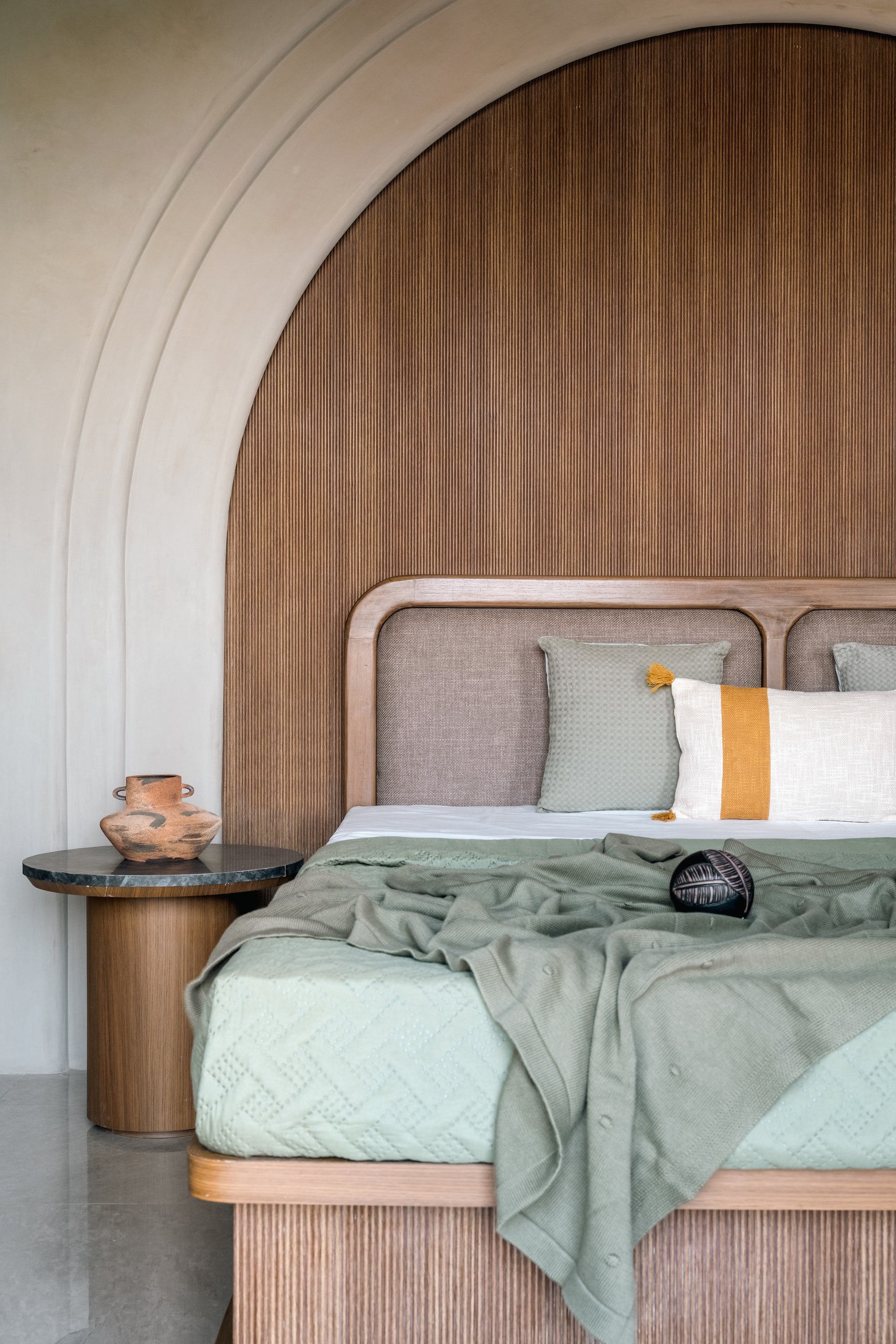 Each of the four bedrooms narrates its own story while adhering to the home’s unified design language. The master bedroom embodies tranquility, with earthy tones, layered lighting, and tactile textiles that evoke calm and contemplation. The children’s room introduces gentle playfulness, balancing joy and serenity through soft colours and smart storage that evolves with growing needs. Meanwhile, the guest bedroom remains elegantly simple, designed with neutral palettes, cozy furnishings, and minimal accents, creating a welcoming refuge.