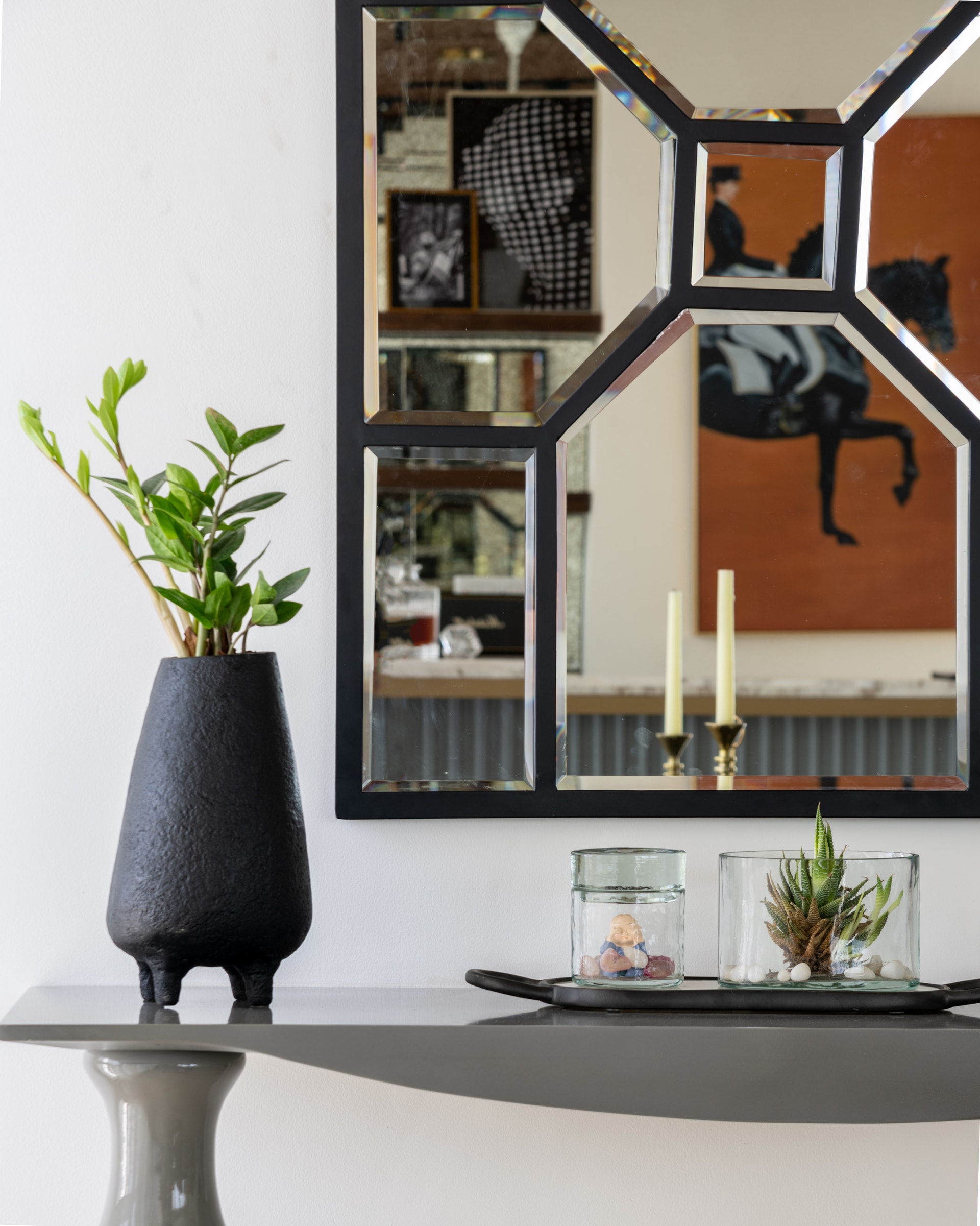 Upon entering the lovely home, one is greeted by an aged, intricately carved wooden console set against a dramatic deep grey panelled wall, complemented by antique mirrors. Abundant greenery positioned by the window, thoughtfully arranged in collaboration with IAAH, serves to enhance the ambiance and set the tone for the residence.