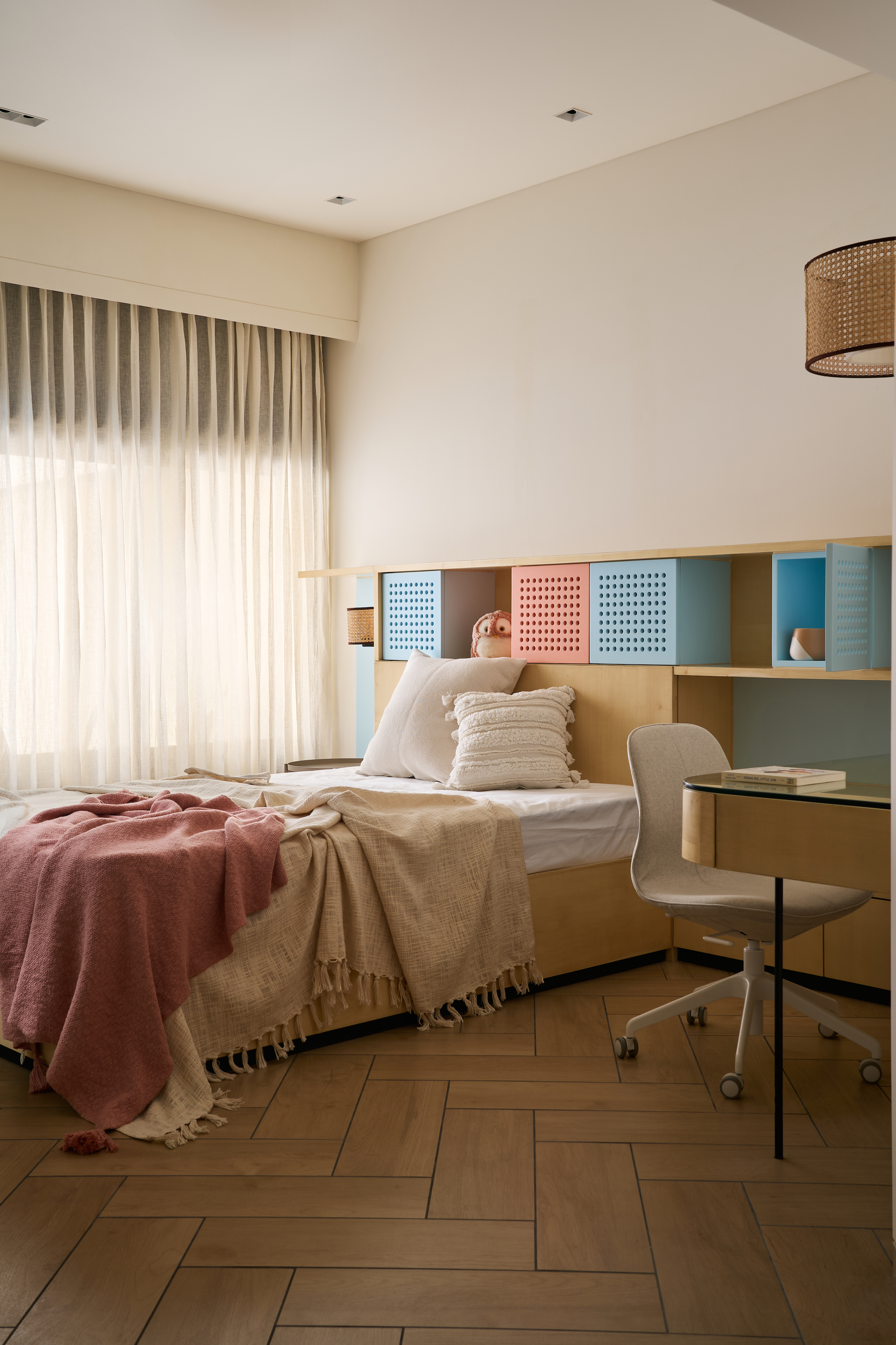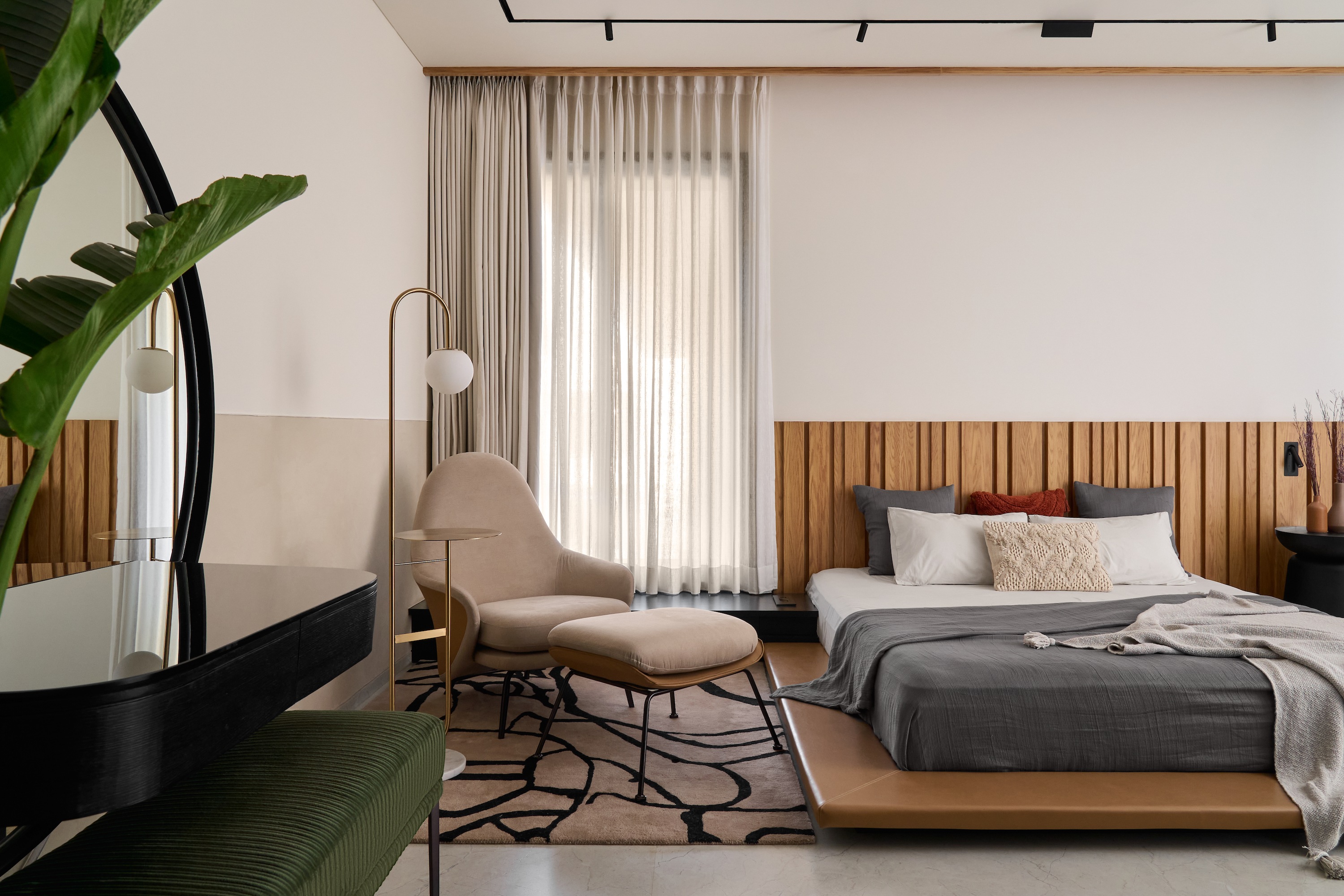 The private spaces reflect an intricate level of design consideration, with each bedroom thoughtfully crafted to embody the distinct personality and preferences of its occupants. Here, the design transforms from the collective energy of the shared living spaces into personal sanctuaries, where calm and individual expression take center stage.