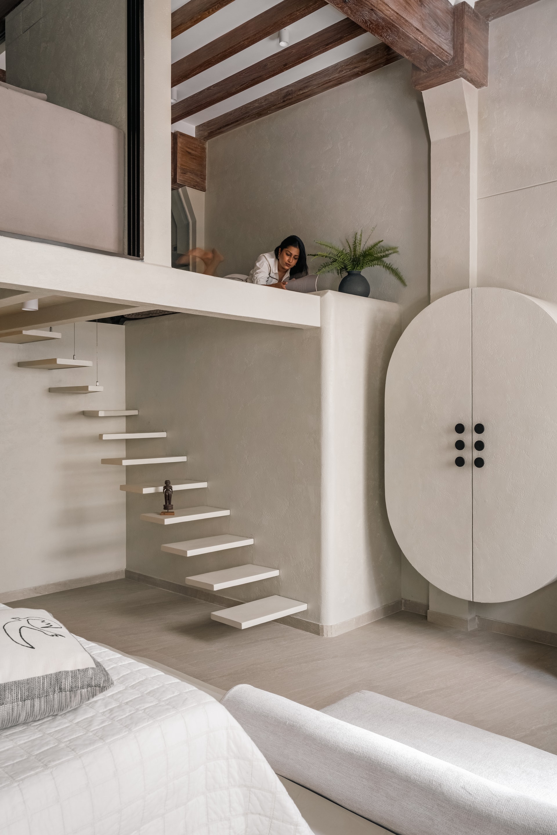 While the visual language of Meherbaan is understated, its functionality is far from simple. The home is designed not as a static space but as a dynamic, ever-adapting environment. The mezzanine cleverly conceals a bar, offering a space for intimate gatherings, while the open-plan living area effortlessly transitions from a social hub to a personal retreat. Each element—from the carefully chosen study chair to the custom-designed sofa—not only serves its immediate function but also contributes to the larger composition of the loft, ensuring that practicality never comes at the cost of aesthetic integrity.