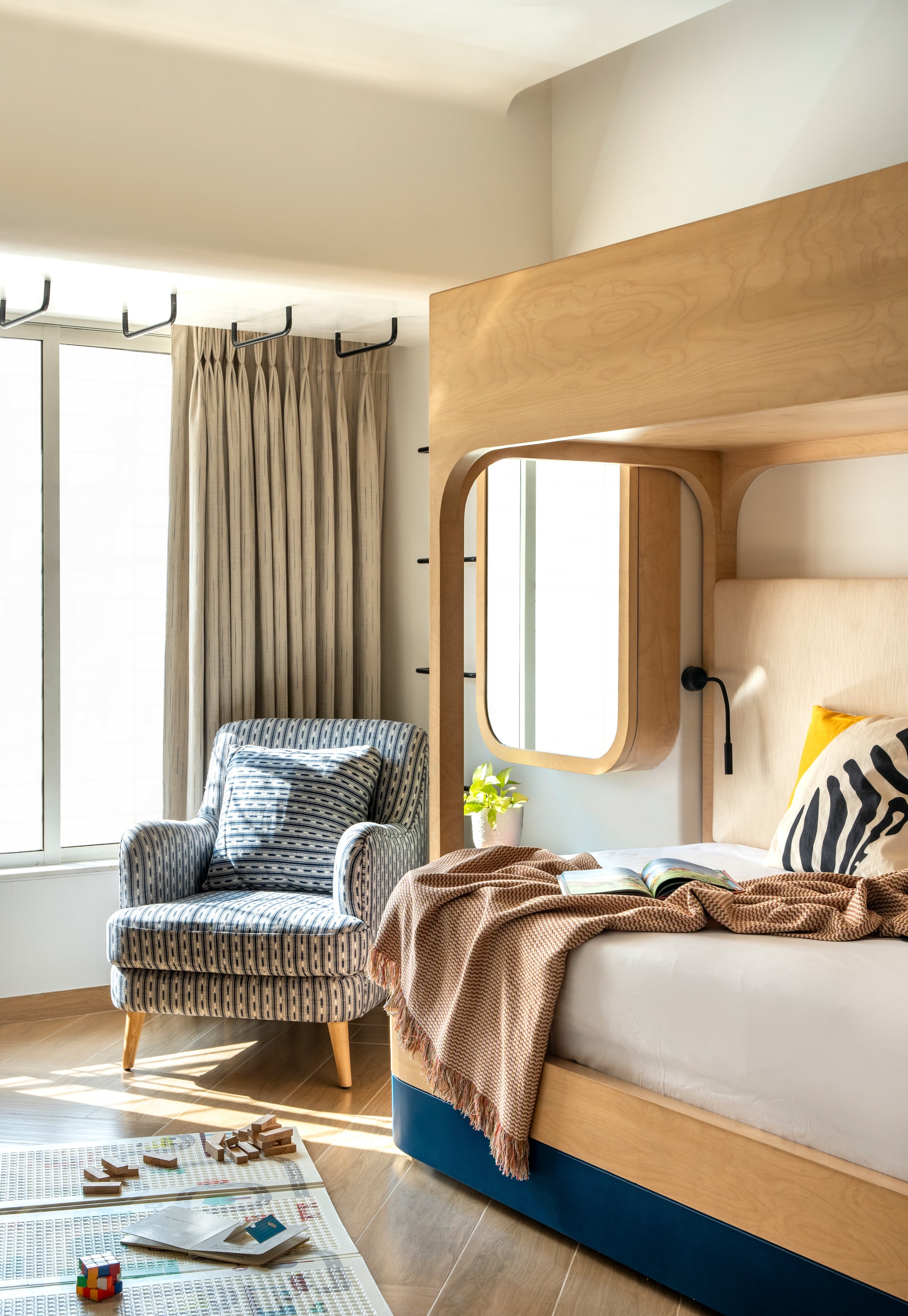 The private spaces reflect a thoughtful shift in tone while remaining true to the overall design language. The children’s bedroom introduces playfulness through chevron-patterned wooden flooring, cobalt blue PU-finished shutters, and custom furniture including a bunk-bed–sofa hybrid and a dedicated study zone. Wall- and ceiling-mounted monkey bars near the window transform the room into an interactive environment, seamlessly merging design with movement and imagination. In contrast, the master bedroom is calm and composed, defined by two-tone flooring subtly divided by a brass pati. Teak veneer furniture with brass handles reinforces material continuity, while the upholstered headboard introduces muted colour through vertical stitch detailing. Floral butta curtains, bespoke moulding details, and matte gold elephant motifs by KalakaariHaath add cultural nuance without visual weight.