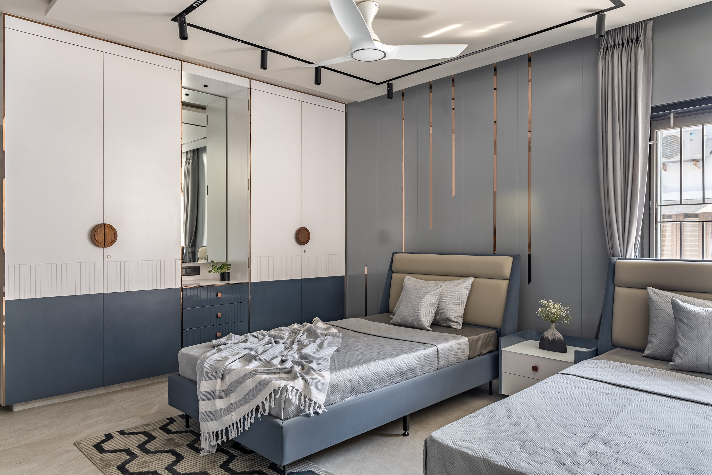 In the children’s bedroom, a palette of steel-blue and whites creates a soothing atmosphere. Twin beds with wardrobes separated by a dressing area make it a sensible design for two kids sharing a room. A cozy nook in the corner is perfect for reading, napping, or lounging. Rose-gold trimmings on the walls and furniture knobs add an elegant touch.