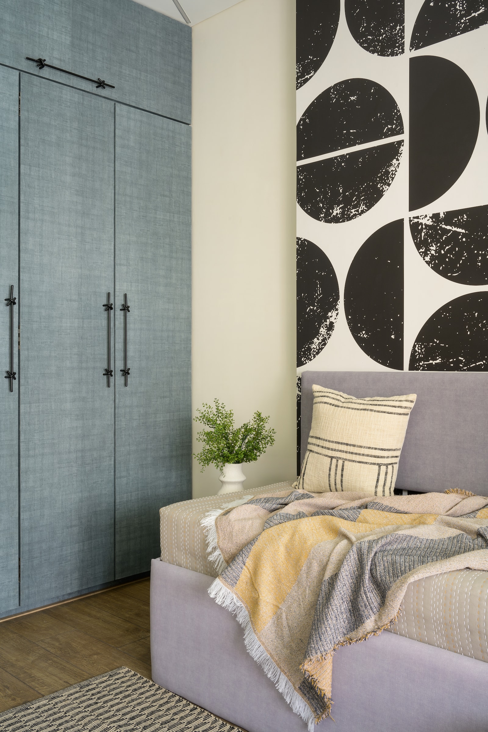 The guest bedroom offers a retreat with its grey fabric day bed, a haven for relaxation. The room is enveloped in rustic black and white wallpaper, complemented by a wardrobe finished in fabric-textured laminate, continuing the retro theme while offering ample storage.