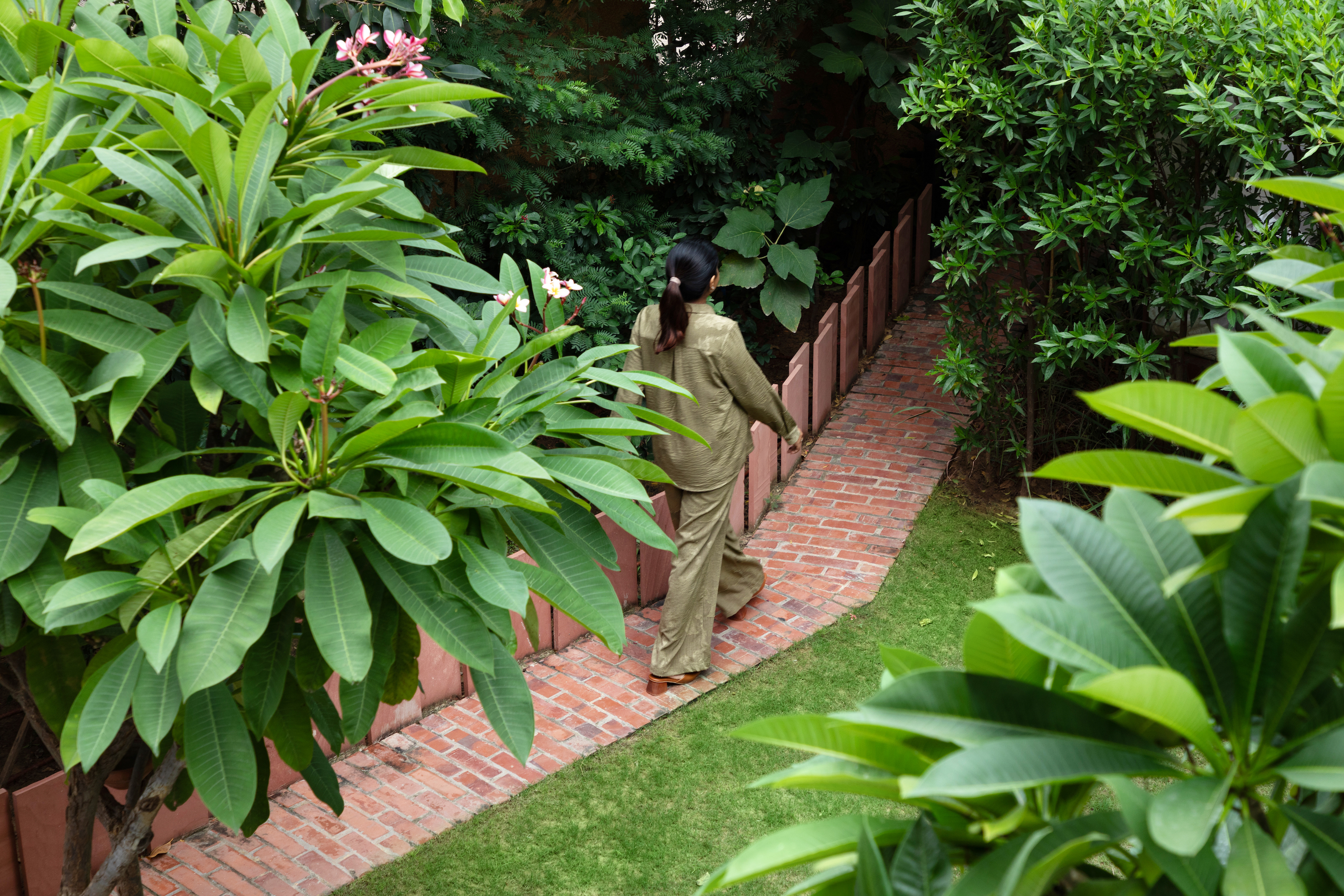 The project’s identity is shaped by the merging of two disciplines. The father’s horticultural understanding informed the planting strategy – species selection, shade patterns, and the alignment of climbers with built edges, while Vipul’s architectural training introduced rigour in material, proportion, and spatial logic. This synergy is expressed not through decorative landscaping, but through calibrated relationships between soil, shade, structure, and light. The garden is not an add-on; it is a spatial device that mediates thresholds, softens massing, and anchors the project to its site.
