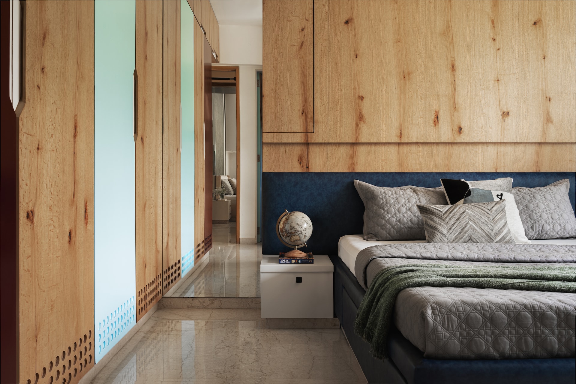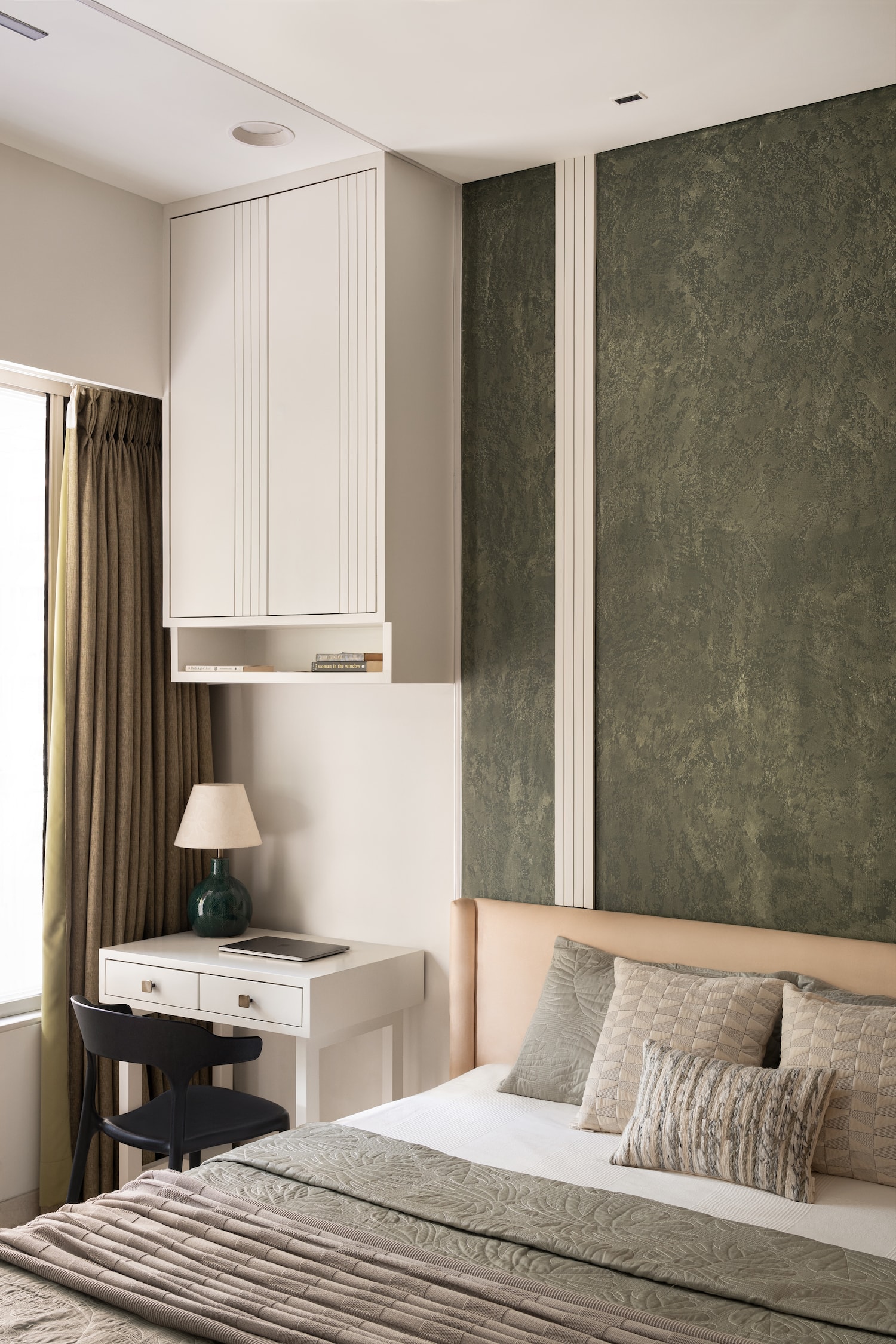 Every bedroom has been carefully planned, making sure each area blends harmoniously while still being individually tailored for each family member. Incorporating sharp lines and a palette of olive green and white, the young couple’s room exudes character and subtle elegance. An elaborate dressing unit and a small study table create a functional composition.