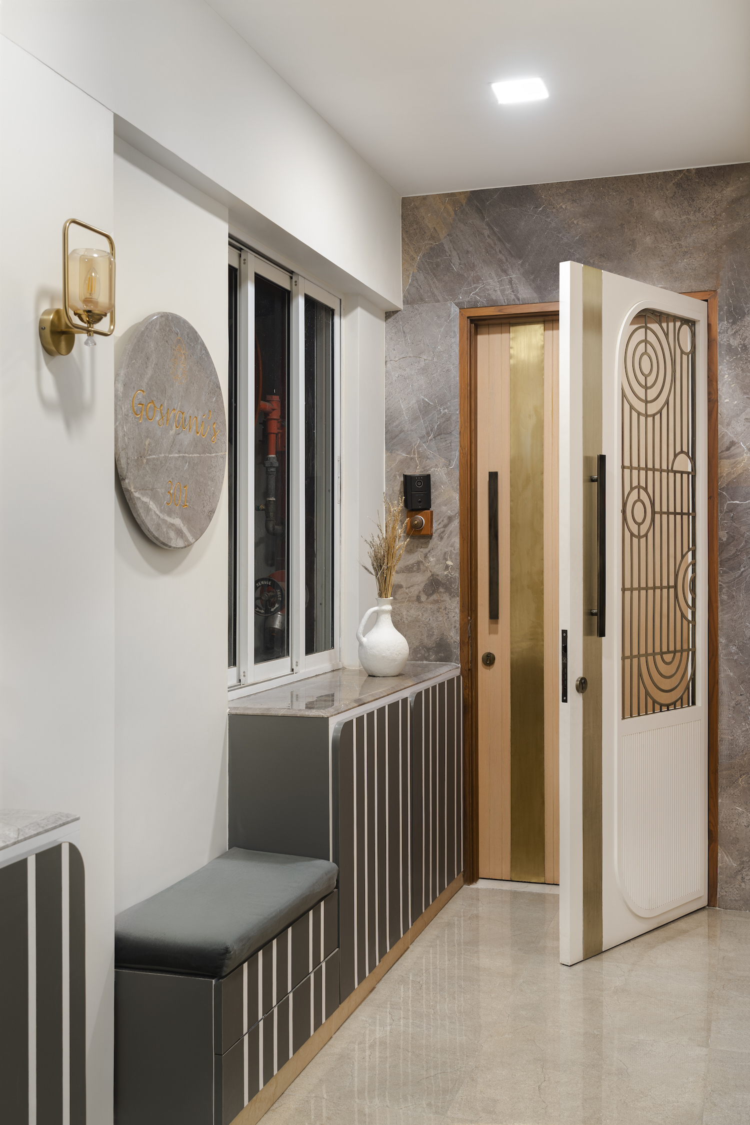 Bestowing a luxurious feel, the entrance features a grey marble-clad wall with a safety door adorned with geometric designs in circles and curves. Storage cabinets and a backlit name plate embedded in marble elevate the whole appeal. Designed to resemble an ivory canvas, the living room imparts a classical zen look. The elegant application of beige on the walls paired with oak wood furniture creates a calming atmosphere. A capsule fluted glass partition separates the dining area. Respecting the client’s Jain belief system, a mandir with ashthamangal on both sides with bells in alternate squares is incorporated. With meticulous attention to furniture details and material experimentation, the sofa, lounger chair, and centre table in the formal living area are designed by Soch Design Studio. A floor-standing swing and oak wood sofa bring functionality and style to the informal living room.