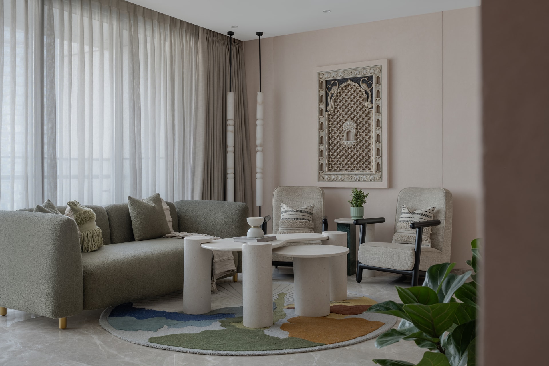 Within the living areas, the design language finds its most expressive yet disciplined articulation. Earth-based tones establish a serene backdrop against which handcrafted wooden elements and cane textures quietly assert themselves. The seating compositions, inspired by traditional archetypes yet rendered in contemporary silhouettes, reinforce the home’s central narrative: heritage adapted rather than preserved. Artworks and artisanal objects contribute layers of identity, yet their placement is measured, ensuring the space retains its composure and spatial clarity.