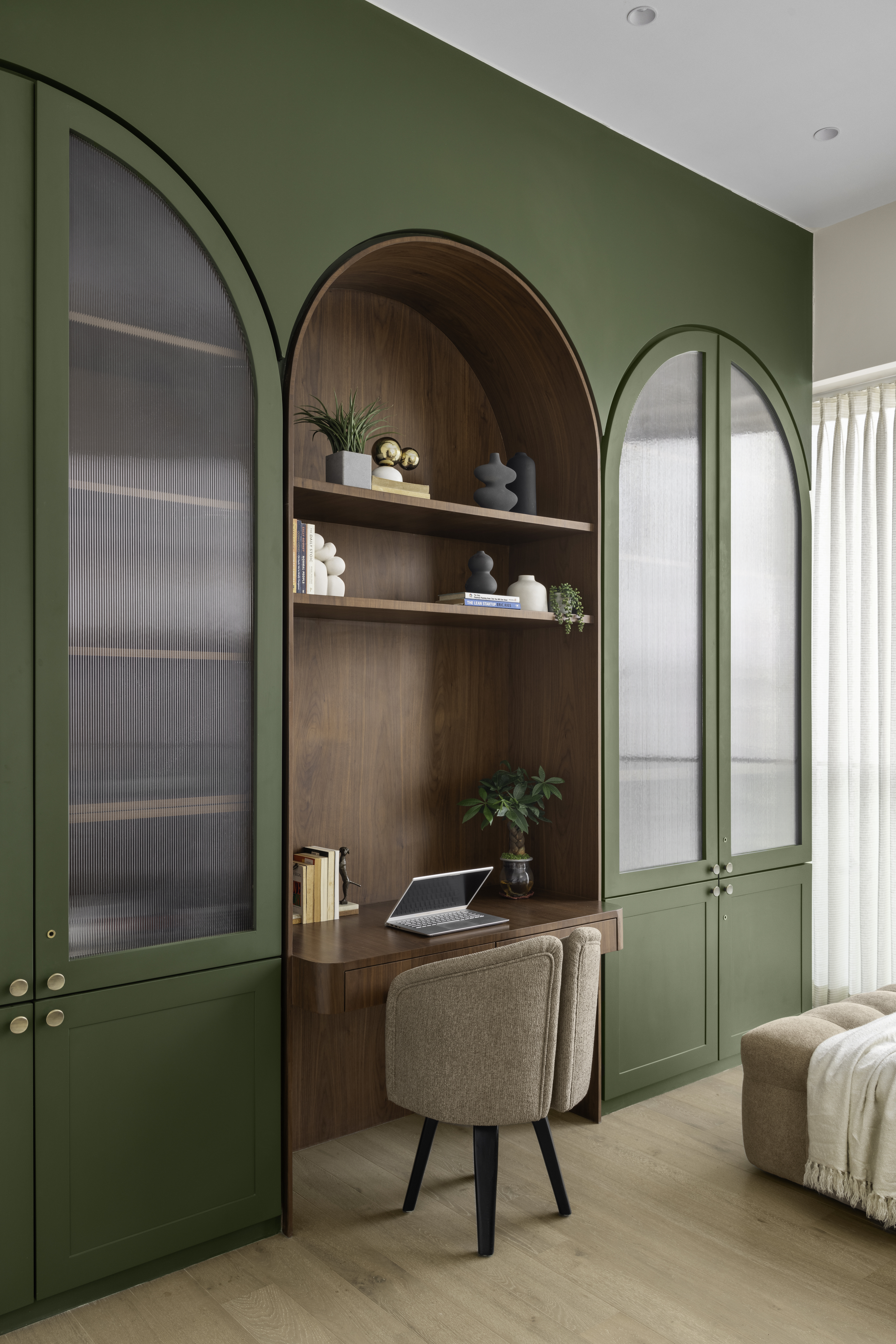 Just beyond, the kitchen introduces a playful counterpoint. The breakfast counter, dressed in exotic Amazon Green marble, conceals a bold surprise: rust-red cabinetry paired with white Caesarstone countertops and patterned Spanish tiles. The automated frosted glass panel, framed in brass, ensures the space transitions fluidly between open and private, social and silent.