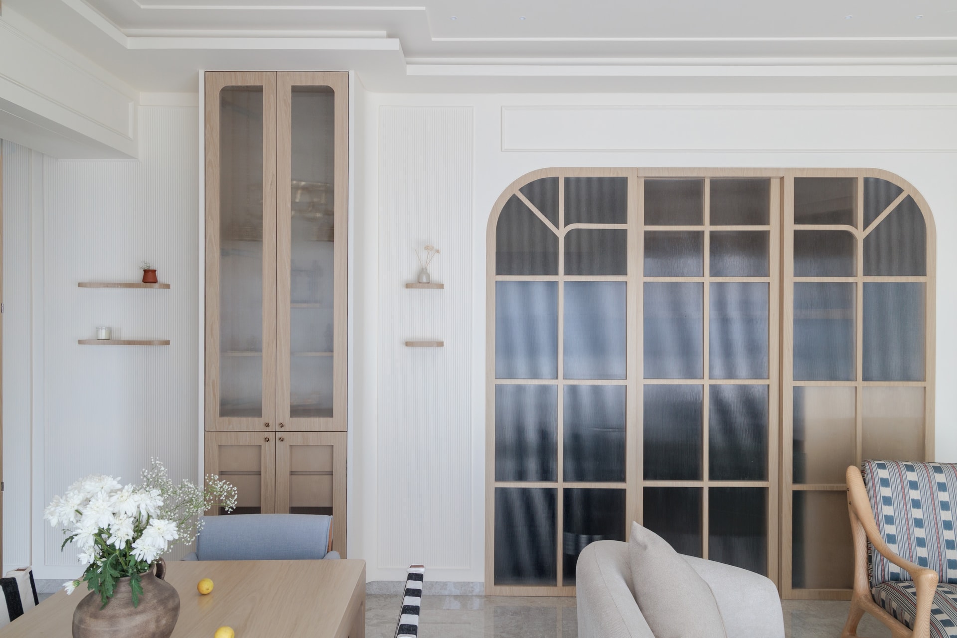 The living room opens onto the dining area and, beyond it, an arched partition in timber and ribbed glass that separates the kitchen. This partition is perhaps the apartment’s most striking built element: a large, softly curved frame with mullion detailing that lends the kitchen threshold the character of a window into another world. Beside it, a glass-fronted display cabinet continues the light veneer palette, anchoring the transition wall.