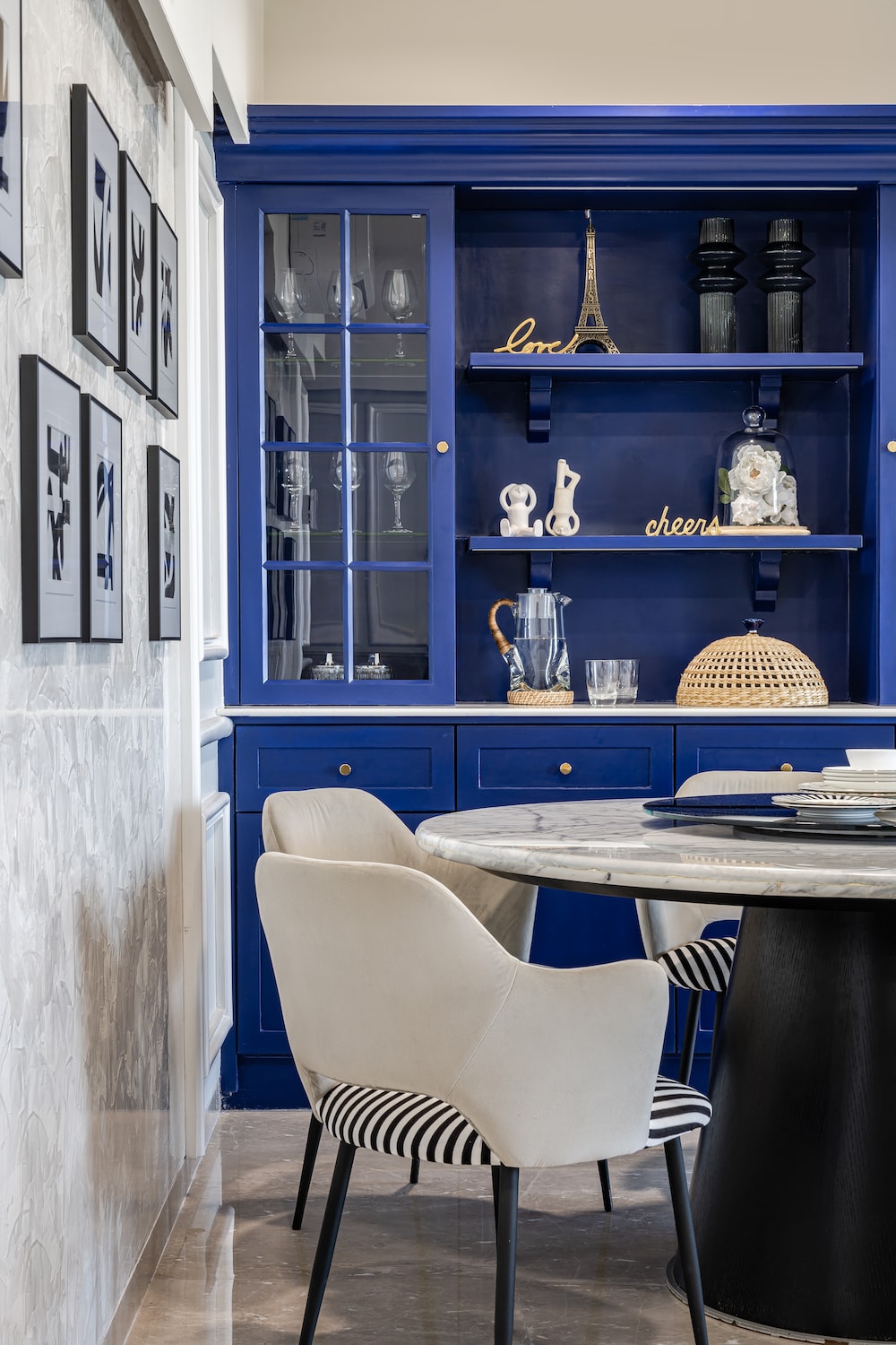 The dining area forms a beautiful cluster of furniture, each playing their part functionally & aesthetically – a stone top round table accompanied by lush dining chairs. As a backdrop stands a tall blue crockery/bar unit with a stone-top surface to work on, glass cabinets and an intricate crowning on top– becoming the focal point of the space. All furniture pieces are crafted and curated with attention to the most minute detail, from their colours to their forms to compliment the space they reside within.