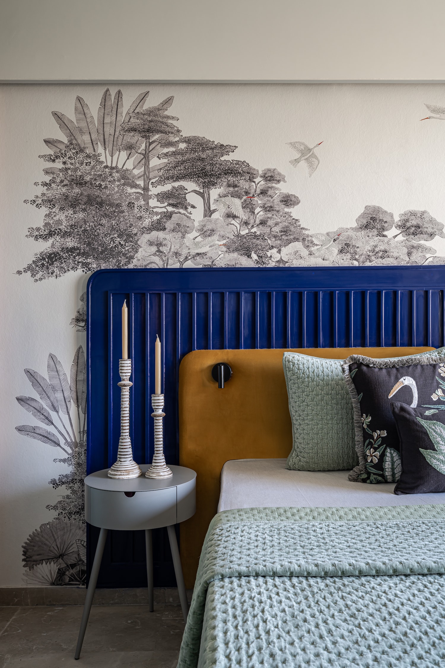 The master bedroom narrates a statement of style with blues and flutes, following the predefined language of this whole project. Compact in character this room is strategized with cohesive materials and colours. The quirky blue bed back has an interesting impact on the eyes, set against a graceful tropical wallpaper finished with accent wall sconces. The room receives a soothing amount of daylight, keeping the space bright & lively throughout the day. The muted green wardrobe has flutings in the middle to break the solidness of the surface and add a linearity to it. The whitewashed ceiling and pale dyed curtains make the room look larger spatially.