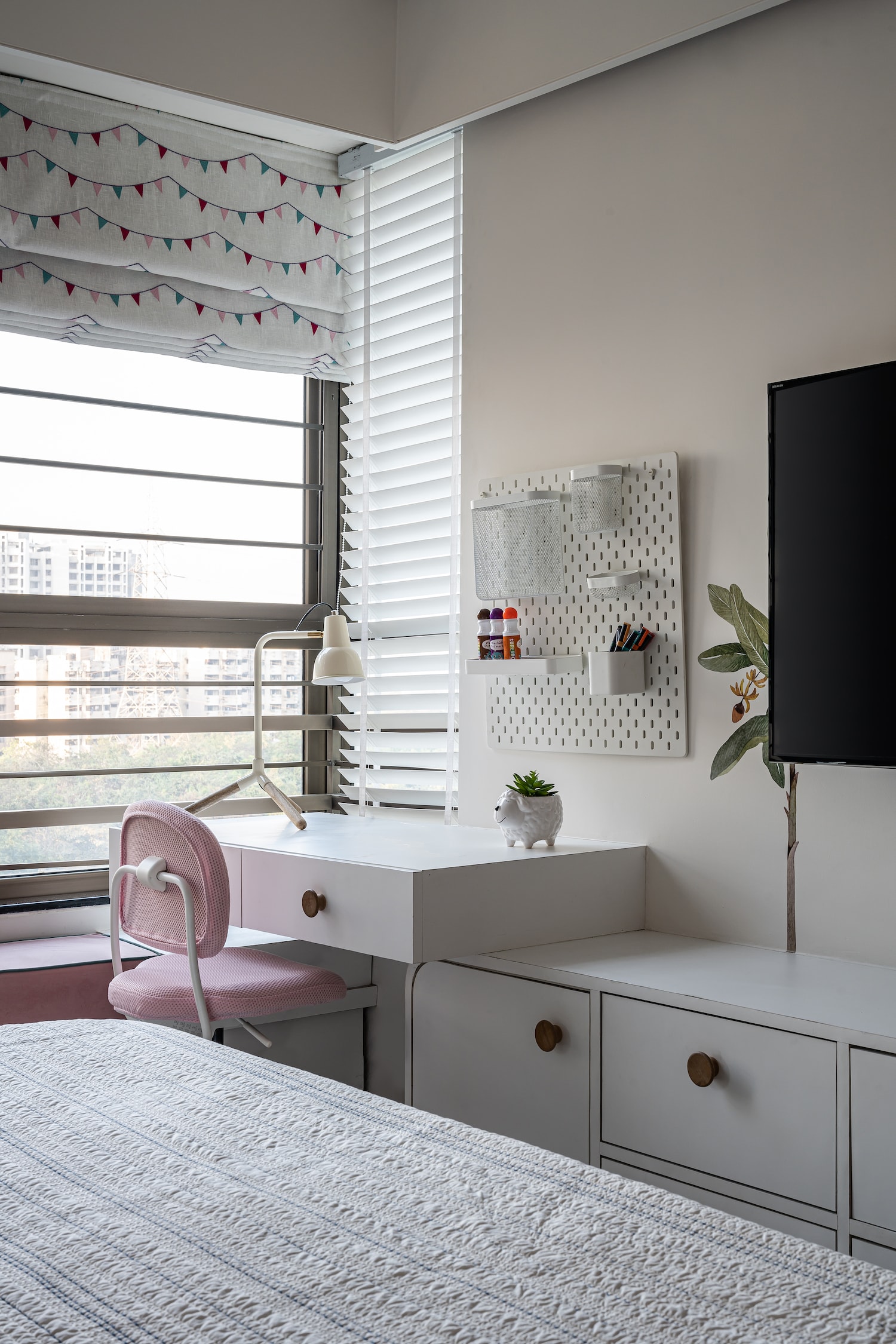 “The daughter’s room in this project is designed to be softer visually, with mild pastels and whites. To further amplify the gentle ambience of the room, we used curves in furniture and elements like mirrors are used. As a backdrop to the whole room is a custom wallpaper, a graphical representation of flora-fauna which brings in the colours that truly celebrate childhood.”