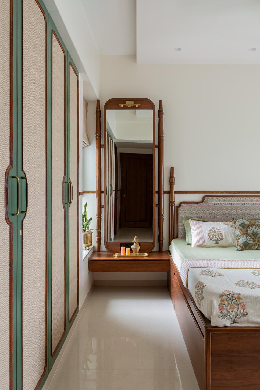 Each bedroom in Ulka unfolds as an expression of individuality. The master bedroom exudes quiet grandeur with its forest-green palette and upholstered headboard framed by delicate columns, a nod to traditional Indian design reinterpreted through a refined, modern lens.