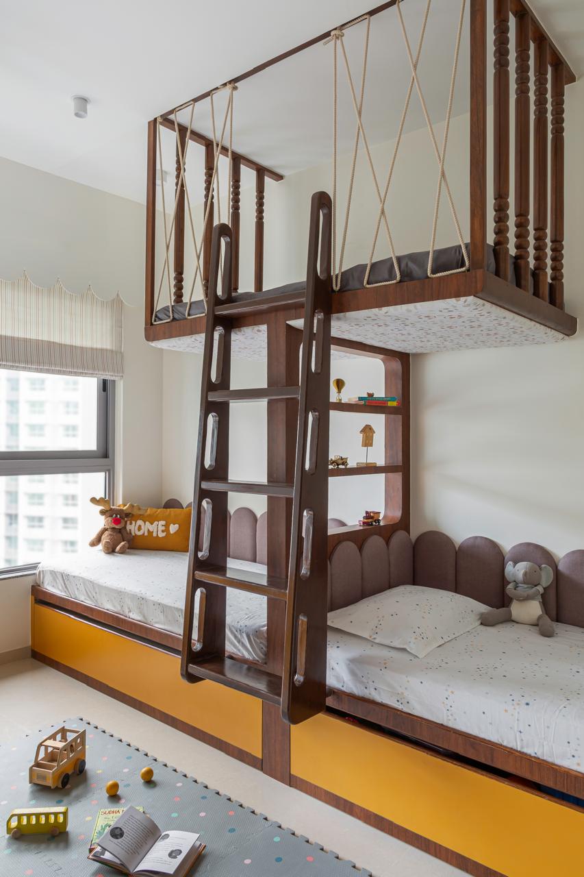 In contrast, the children’s room bursts with vitality. Mustard yellow and soft grey infuse playfulness, while a custom bunk above the beds transforms into a whimsical play zone, doubling as a cozy retreat for imagination. Meanwhile, the guest room and study merge practicality with poetry: a built-in bed with concealed storage, an arched bookshelf above the desk, and a misty blue ceiling lend this space its introspective calm. The restrained materiality and efficient planning ensure the home feels expansive without excess.