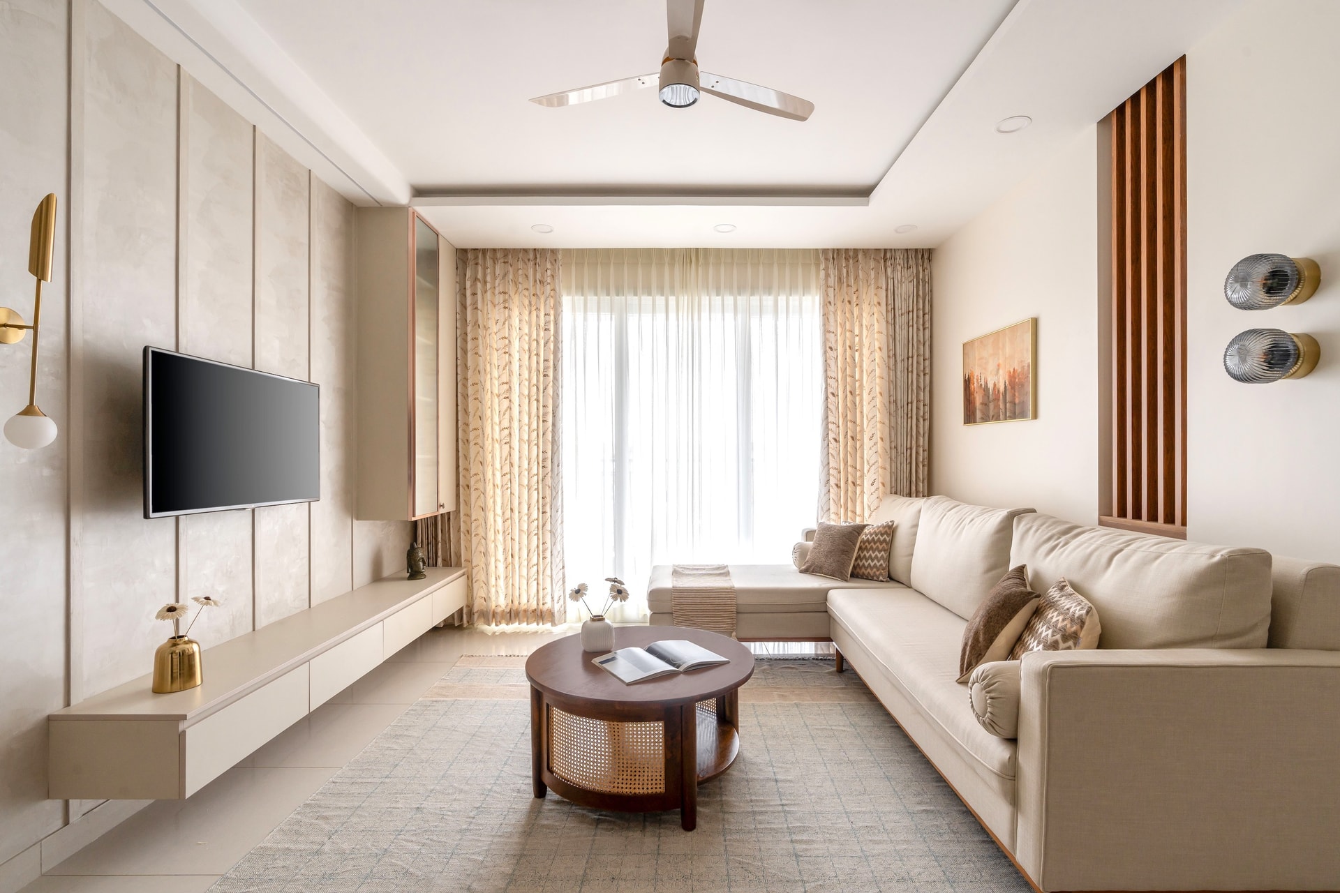 The living room, a quintessential expression of modern minimalism, features a sleek TV unit with vertical paneling as its focal point. Below, a floating cabinet offers ample storage, maintaining a clean, uncluttered aesthetic. The space is further enhanced by a gold wall sconce and a decorative vase, infusing an elegant touch. Curtains with a delicate leaf pattern subtly bring nature indoors, echoing the tranquil environment.