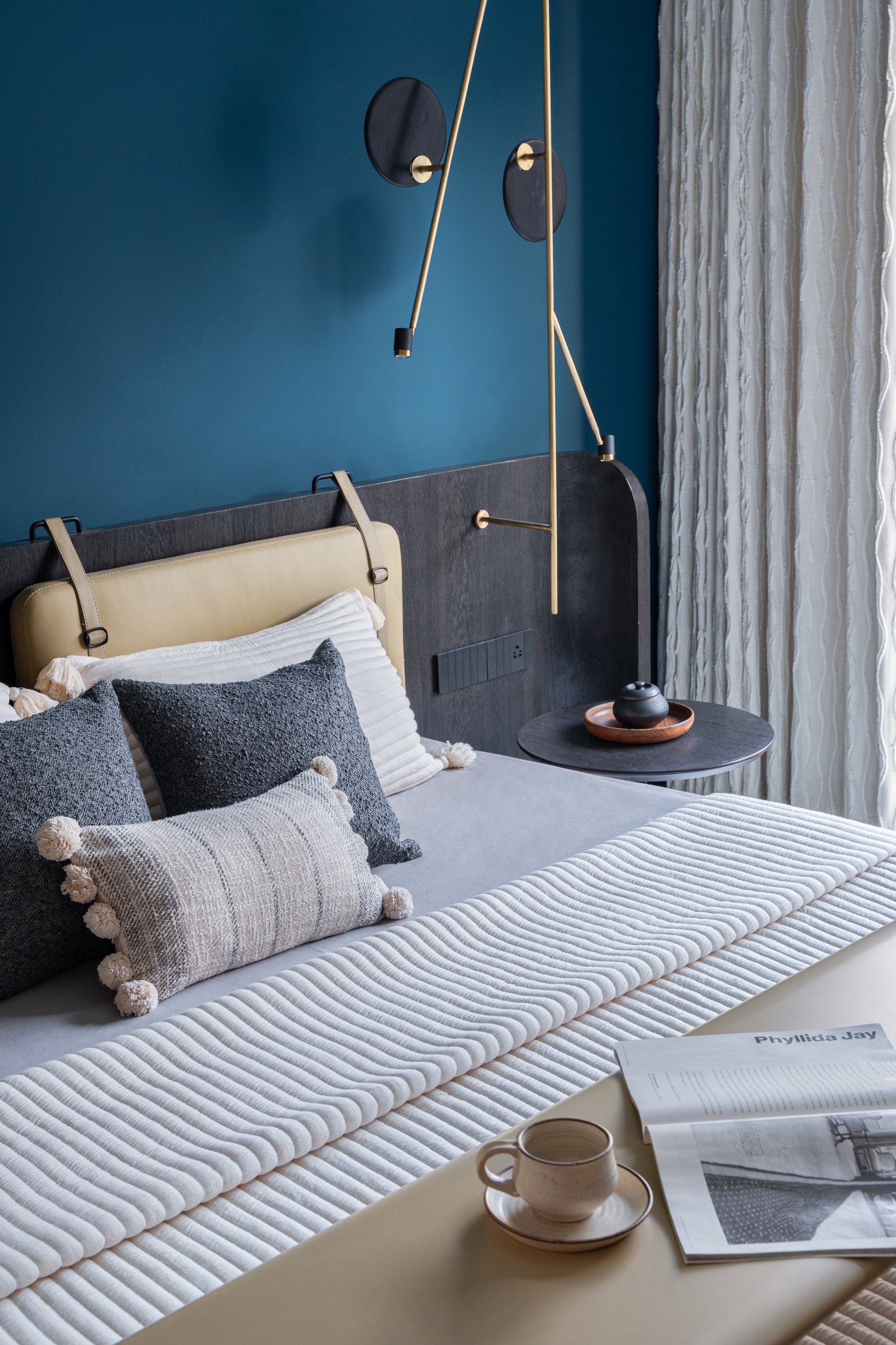 Stepping into the younger son’s bedroom, the foundation of the space design lies in weaving the design with a blue palette, where hues of neutral and black come together to create a serene and understated backdrop, evoking a sense of enduring refinement. A calm oasis of skillfully curated tones whispers minimalism with sharp design sensibilities. The bed back, an artistic tailored canvas, captures the spotlight, emphasized by the subtle play of customized lighting, effortlessly transforming the space into a cozy haven. To introduce a youthful element, the correlativeness of the space is skillfully contrasted by a distinctive and crisp study design, adding depth to the bedroom décor. In response to the post-COVID work-from-home trend, this bedroom incorporates a study design that prioritizes comfort and serenity for extended remote work hours. From the clean ceiling to the soothing furnishings, the futuristic design perfectly mirrors the client’s vision of creating a bold yet soothing retreat for the son.