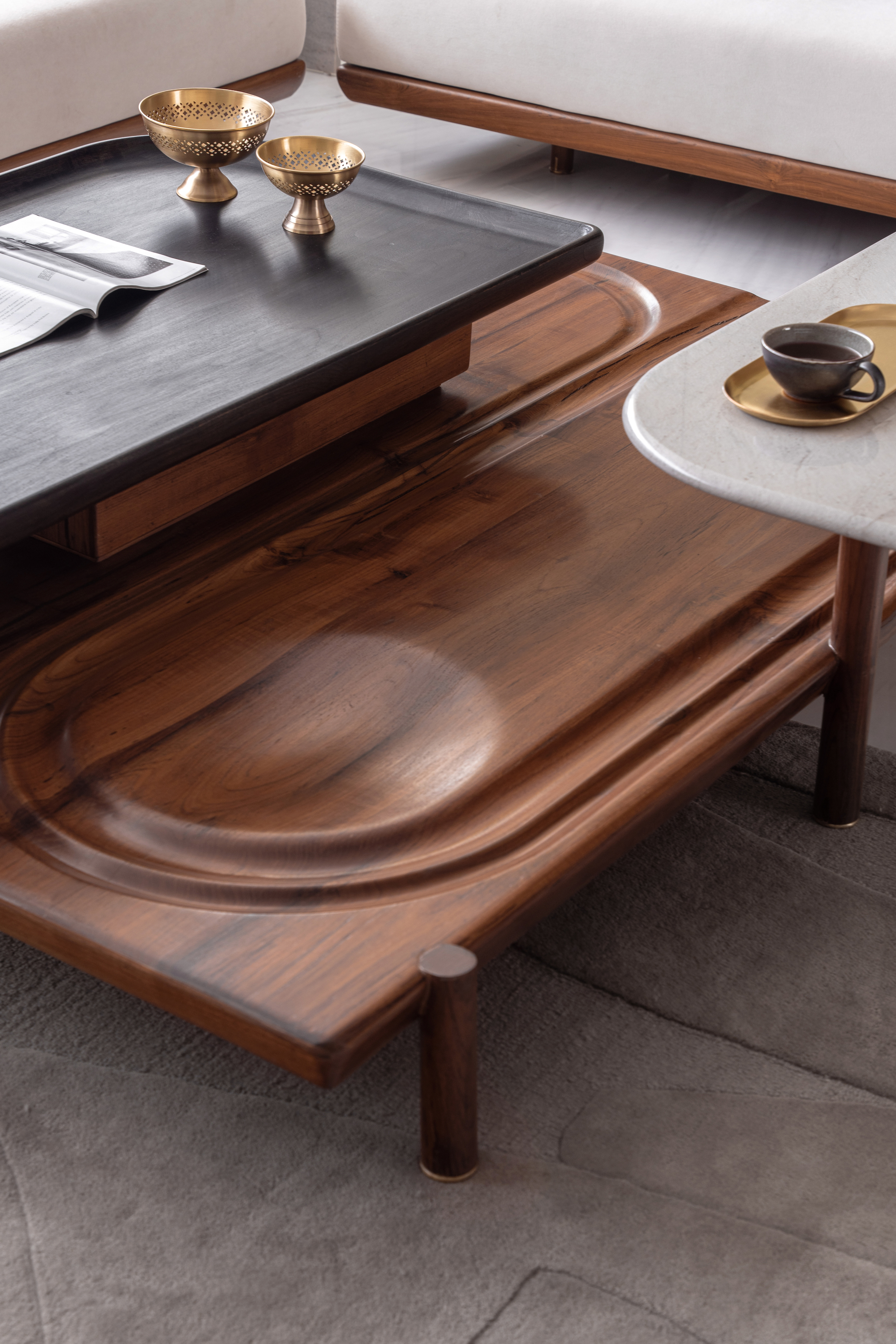 To further elevate the bedroom’s functionality and aesthetics, the design introduced an ergonomic yet sleek console table, featuring a curved solid teak wood edge, seamlessly supported by the wall. The design philosophy revolves around the celebration of materials in their truest form while preserving functionality and aesthetics. This integration is a true testament to the commitment to crafting spaces that are not just beautiful but also deeply enriching.
