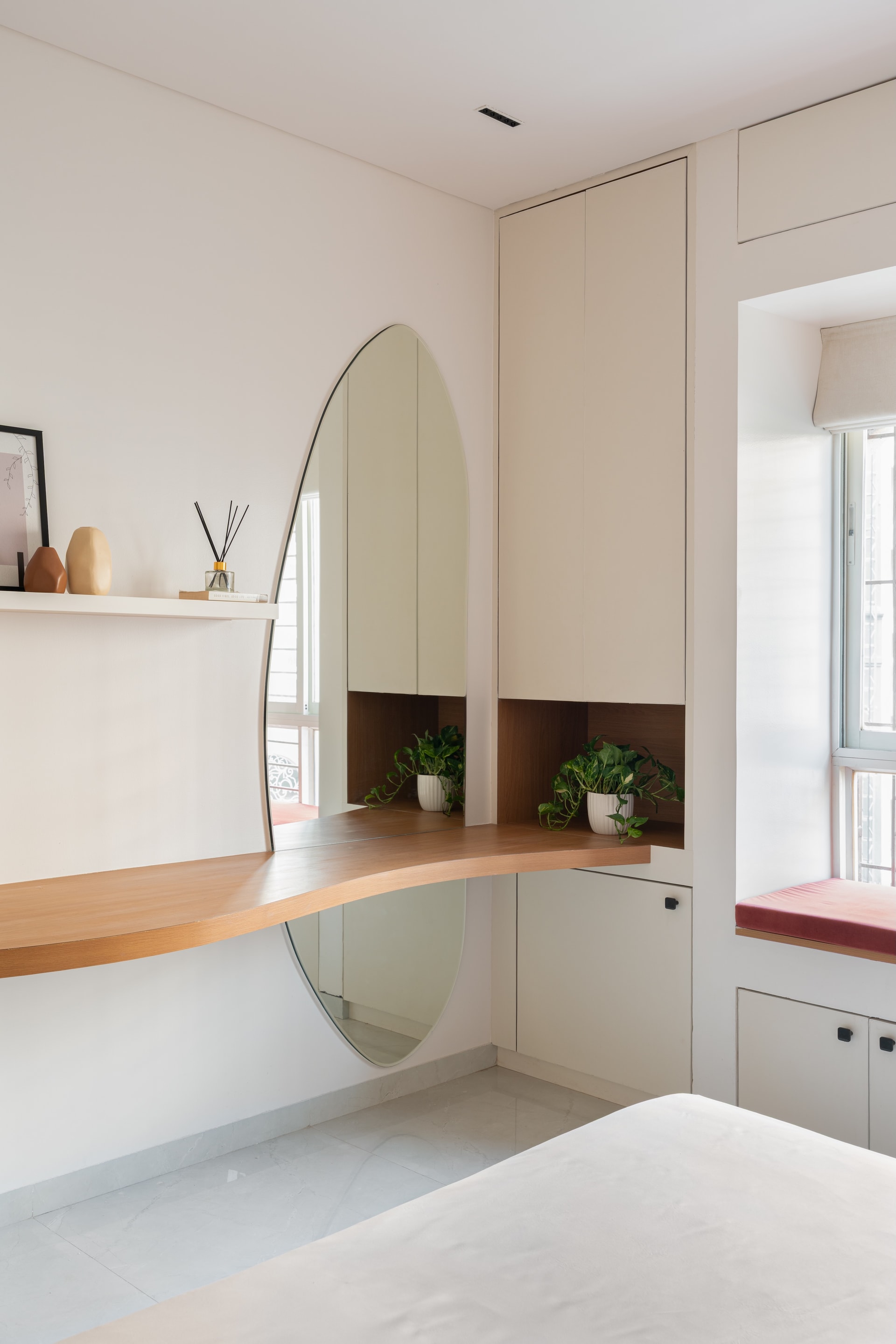 The wardrobe wall, seen in detail, reveals how the studio integrates a dressing nook into the bedroom’s storage system. A curving timber counter extends into the corner, where a dark timber-lined niche sits between the wardrobe doors, while the cream-finished wardrobe doors maintain the room’s overall calm. It is the kind of resolution that compact homes require and rarely receive.