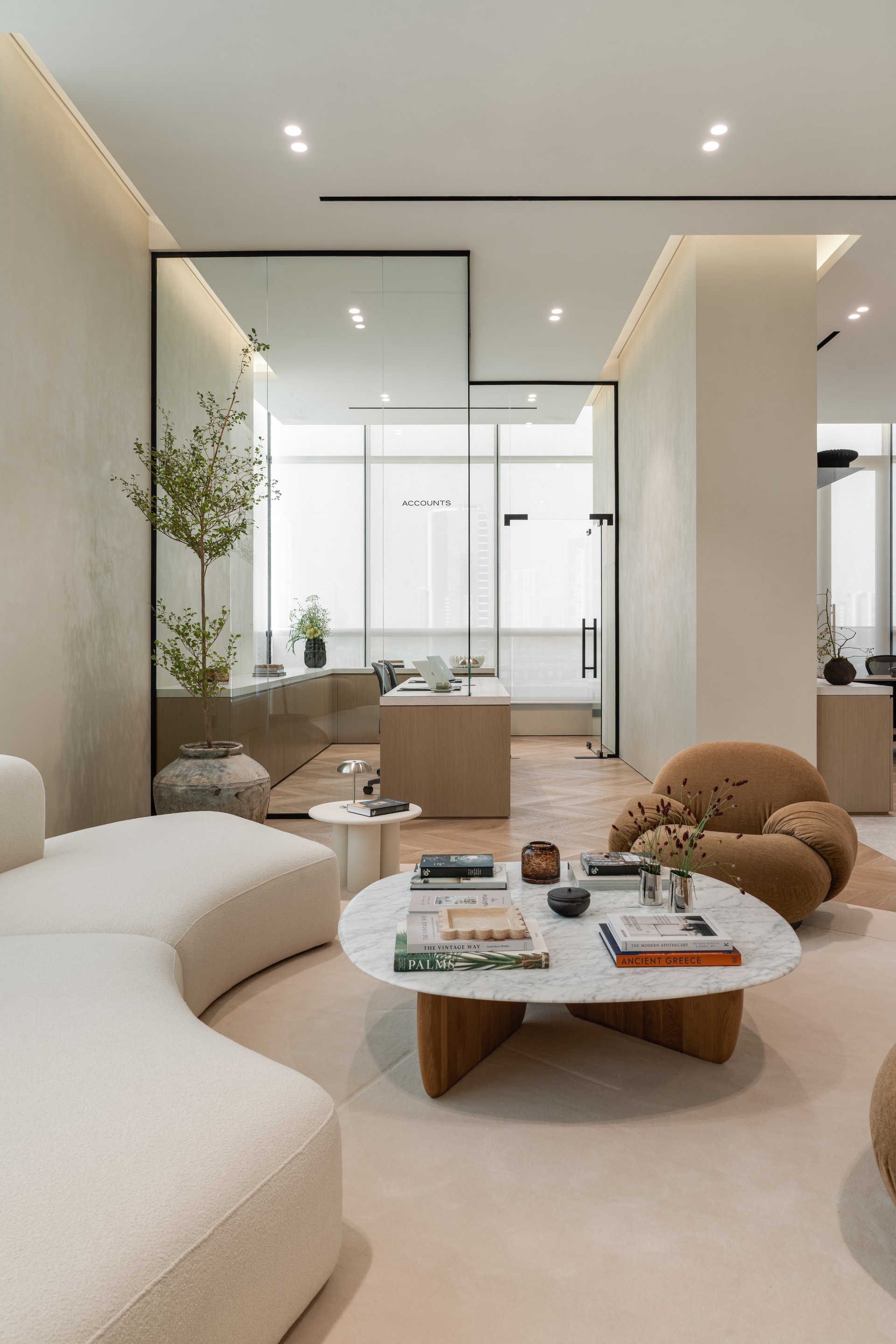 Rather than a traditional reception area, the entrance unfolds into a curated lounge defined by soft sculptural seating, marble-topped tables, and warm neutral tones. The spatial arrangement encourages conversation and relaxation, creating a setting that feels closer to a refined living room than a typical corporate waiting area.