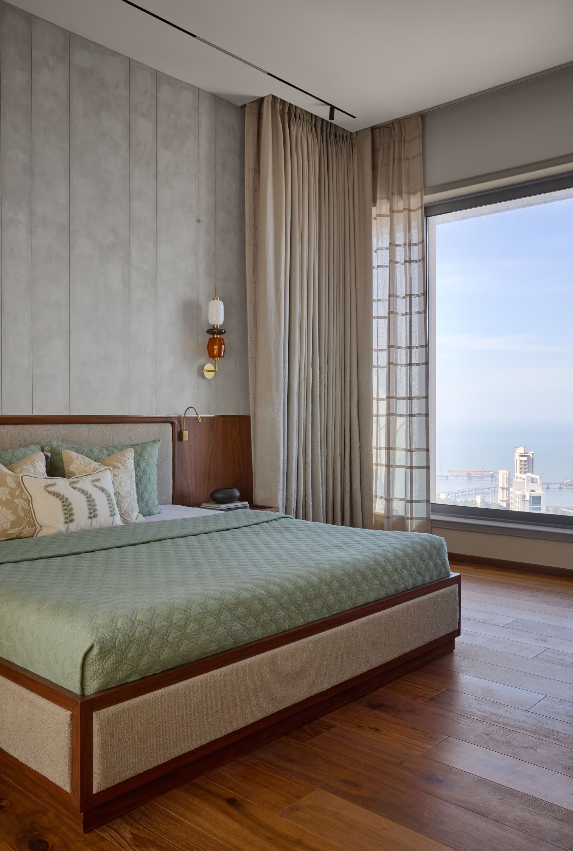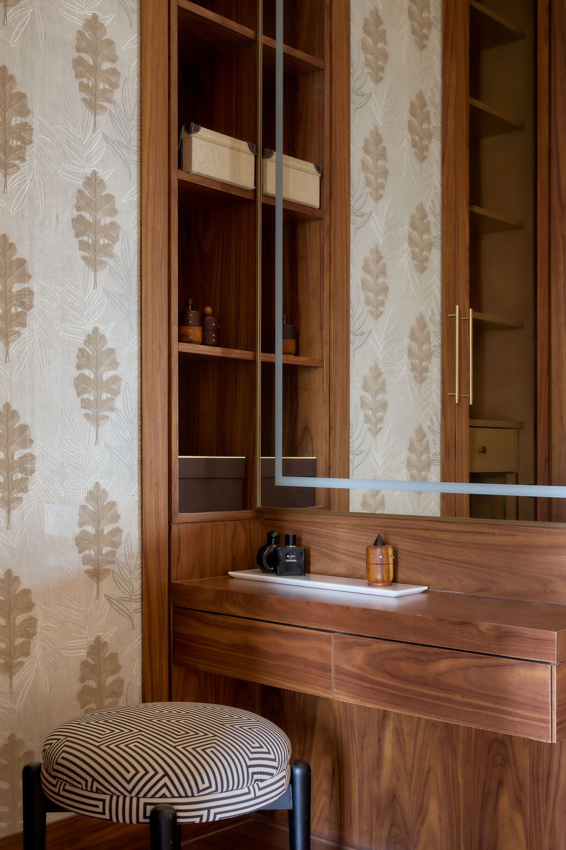 Meanwhile, the master bedroom, with its walk-in wardrobe and en-suite bathroom, embraces a quiet sophistication. Here, a tactile mix of wood, textured paint, and brass accents lends depth, while wardrobe shutters alternating between tinted glass and linen fabric add an element of understated luxury.