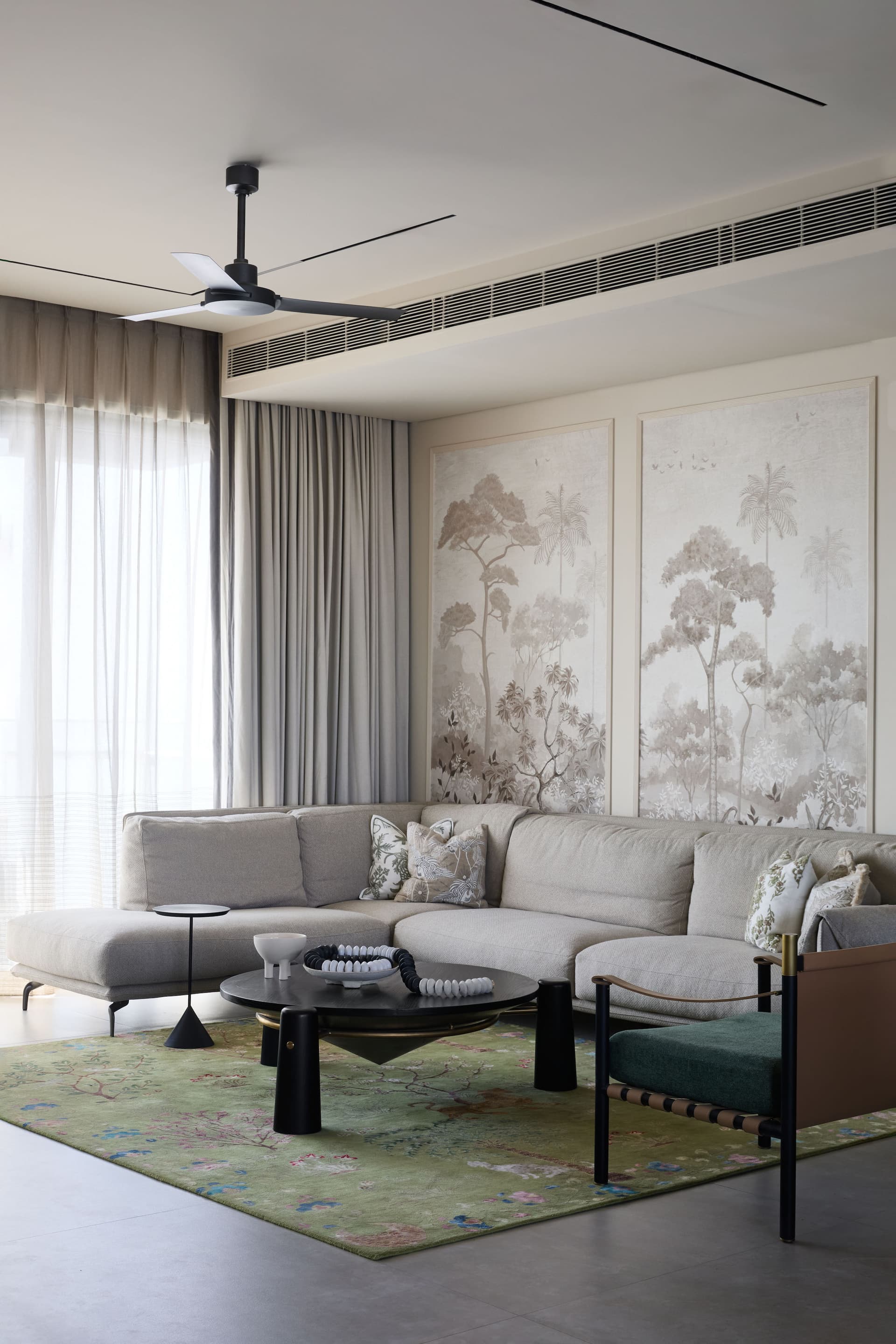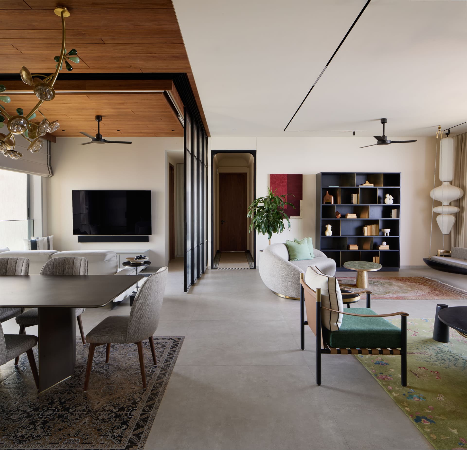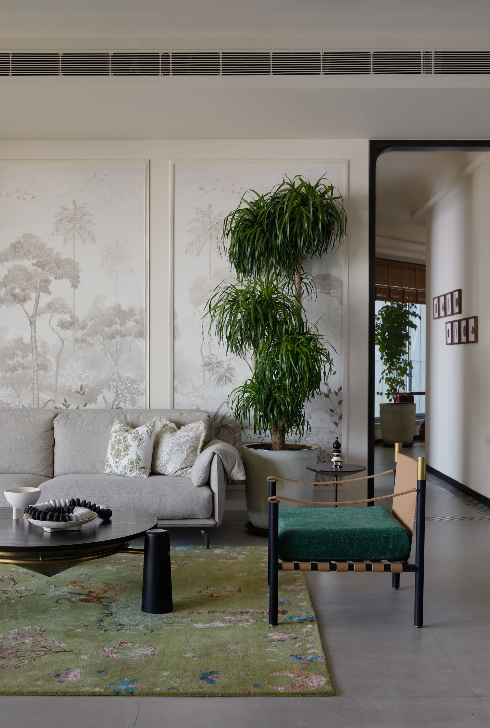 The living area is an inviting expanse, divided into two distinct yet interconnected seating zones. The formal section features an L-shaped sofa and armchairs, while the informal lounge—defined by a curved sofa, a classic Indian swing, and a bookshelf—offers a relaxed retreat. A custom wallpaper with moulding detail forms an elegant backdrop to the main seating area, adding an intimate, bespoke touch.